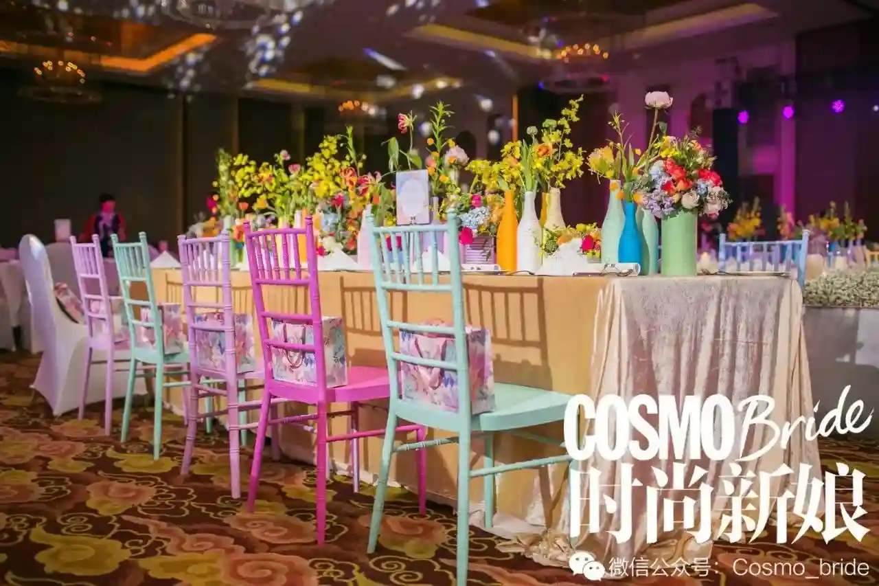 除了花卉,也可以选择其他的,彩色的丝带、彩色的水果,甚至是找出一些闲置的旧物进行改装、色设计,最后可能会得到不一样的效果。简单的DIY是一种很节省预算的方式,而且亲手制作会具有特别的意义,婚礼结束后还可以用来收藏。
