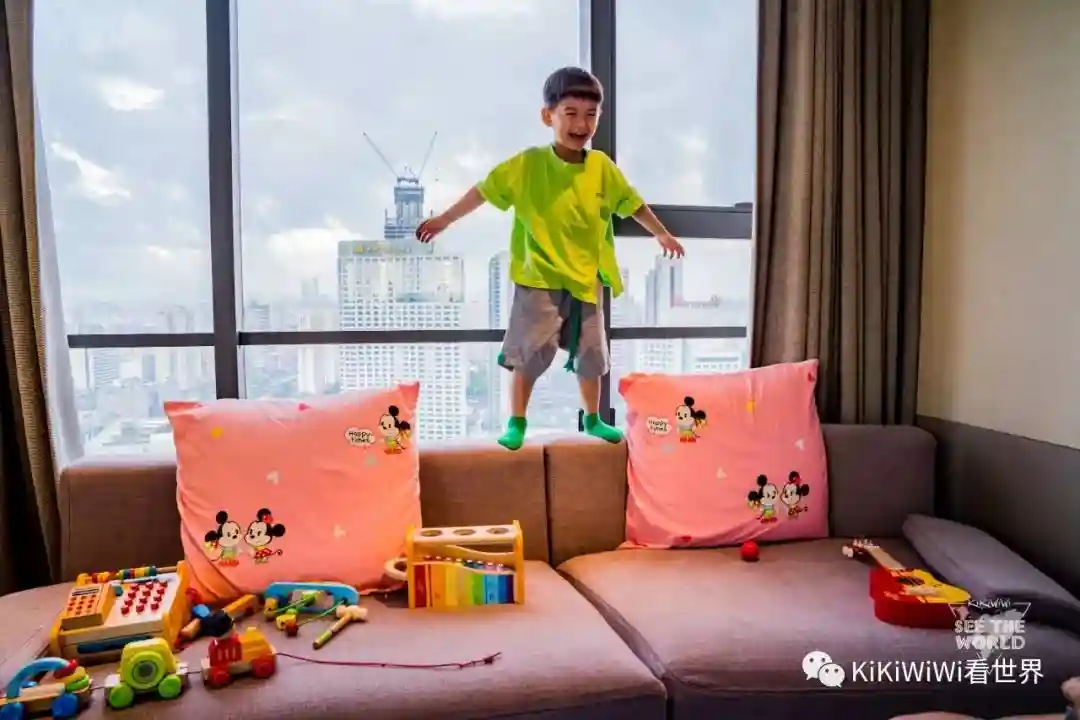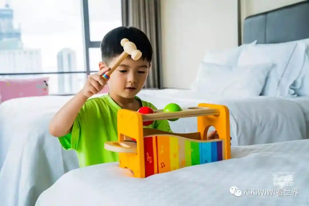 威斯汀酒店还推出了亲子房,比如我们这间。里面准备了很多玩具,比如小乐器、灶台、淋浴玩水的玩具。小朋友刚到威斯汀的头一天可是高兴坏了,这种设置很细节也很贴心。