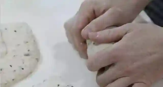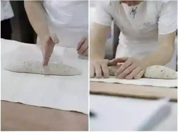 用手按压每个面团,再从远离身体的一边开始往身体这侧卷面团,卷成椭圆形,放在室温下松弛15分钟。
