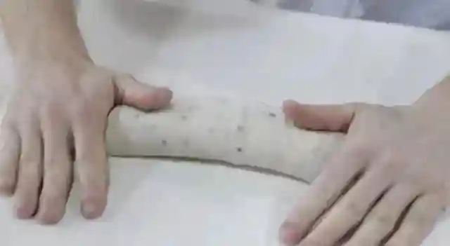①用手搓椭圆形面团,整形成两头尖、中间宽的梭子形,长约35厘米。