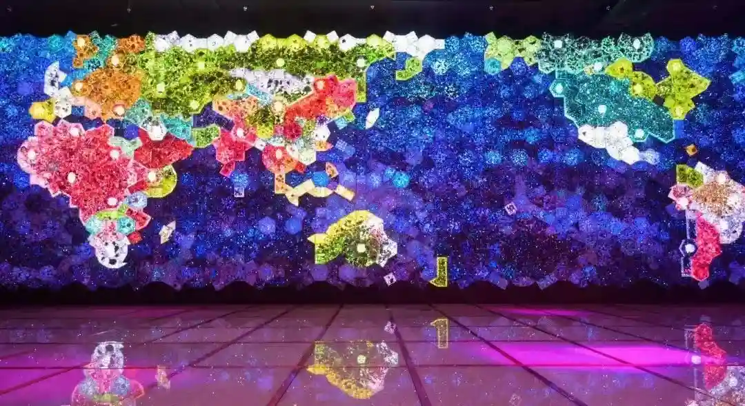 璀璨与美感相互交织的珠宝墙是深圳“珠珠女孩”打卡的必选地!“世界宝石墙”由200多万颗宝石组成,总重量达15吨,约7500万克拉,是水贝珠宝集团和中央美院联手打造的项目。这幅“宝贵”的墙面以世界地图为图形,每一颗宝石都是经过纯手工打磨和拼接,每一颗宝石都大有来头,是“一带一路”沿线30多个国家最具代表性的宝石。这面宝石墙被吉尼斯世界纪录认证为迄今“面积最大、珠宝种类最丰富”的宝石壁画作品。