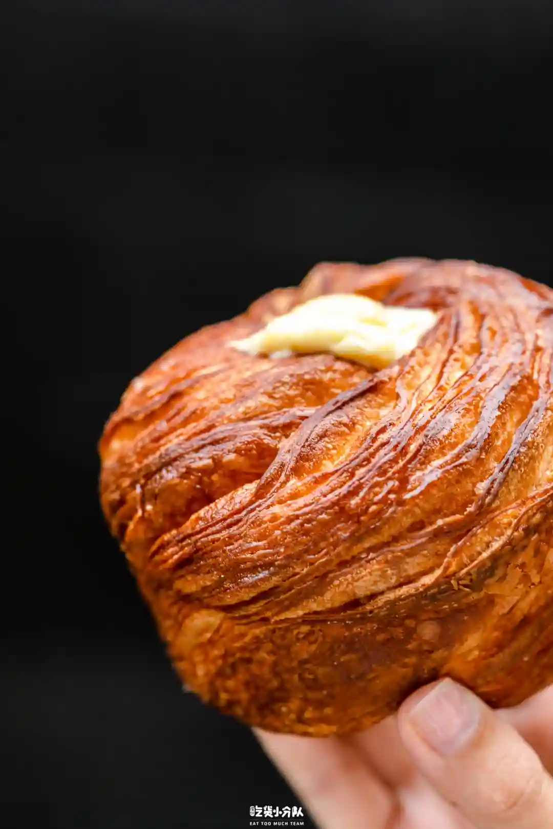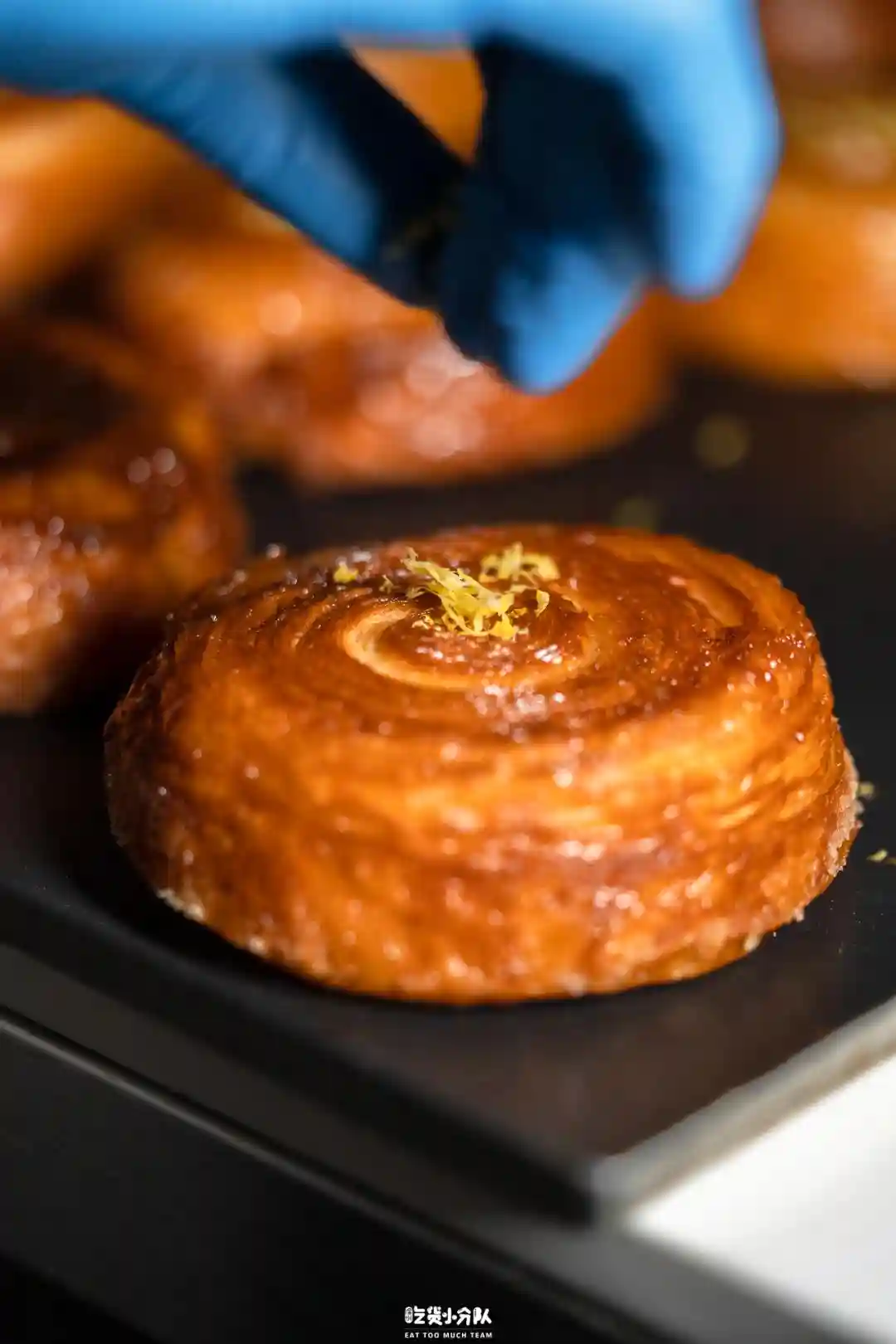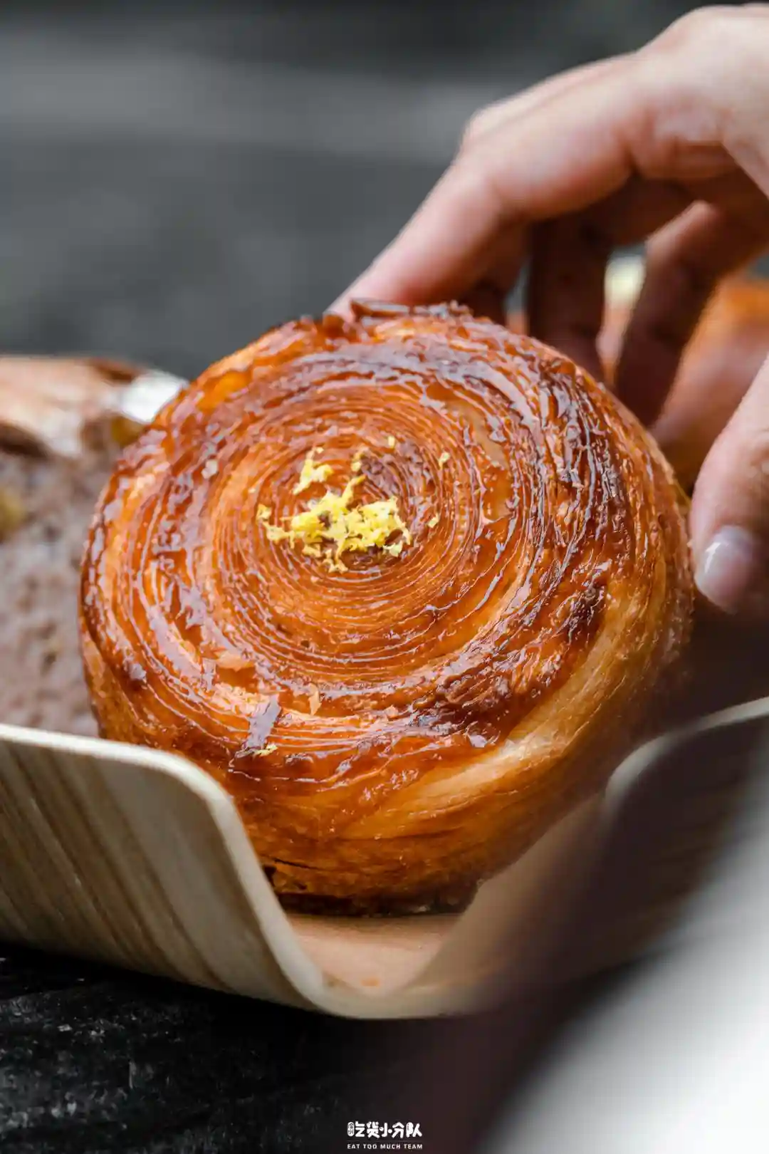 法式柠檬安曼卷,也是领展中心城店的限定新品。法国诺曼底黄油揉进法国大磨坊面粉内,不断折叠、擀开,多次重复操作形成层次。表面经烘烤为焦糖层,再缀以柠檬。酥脆中带有柔软,细嚼黄油味浓郁,还散发着柠檬的清新香气。