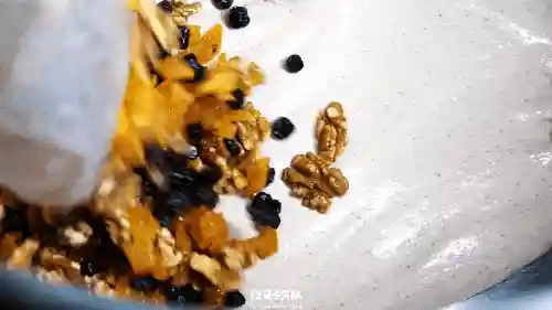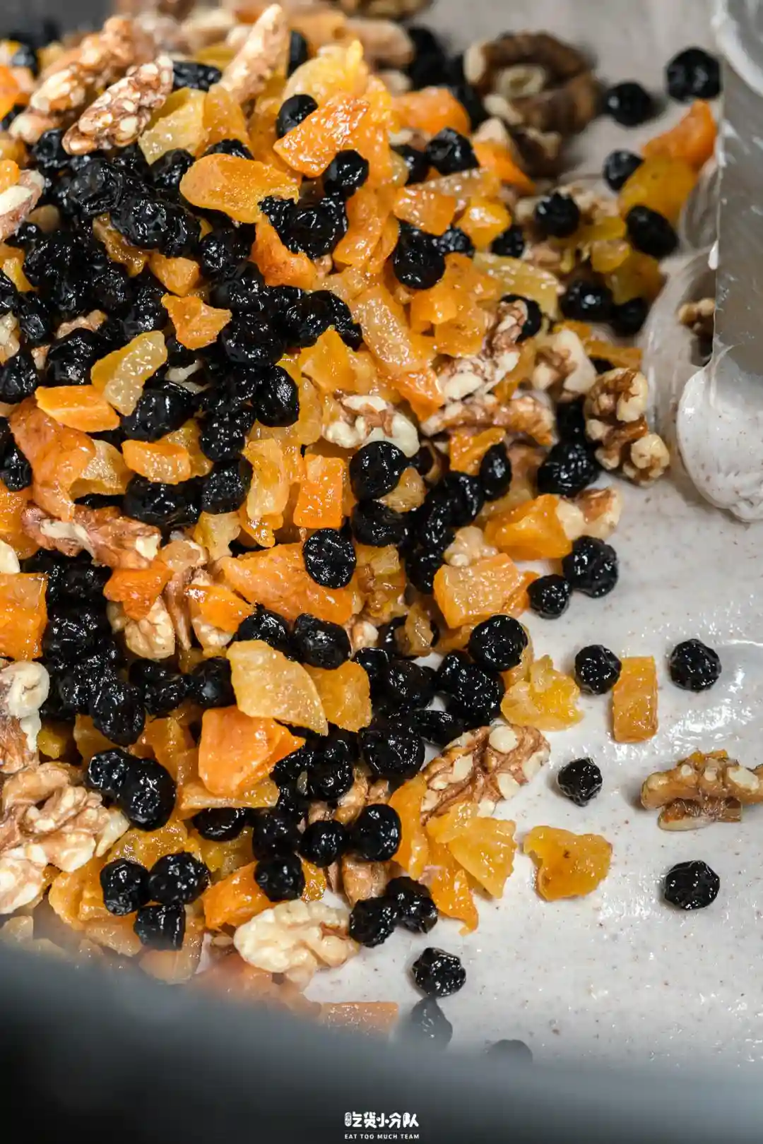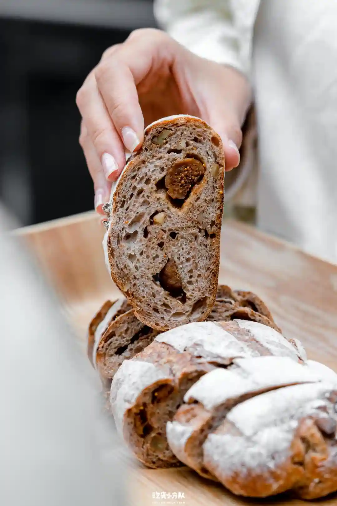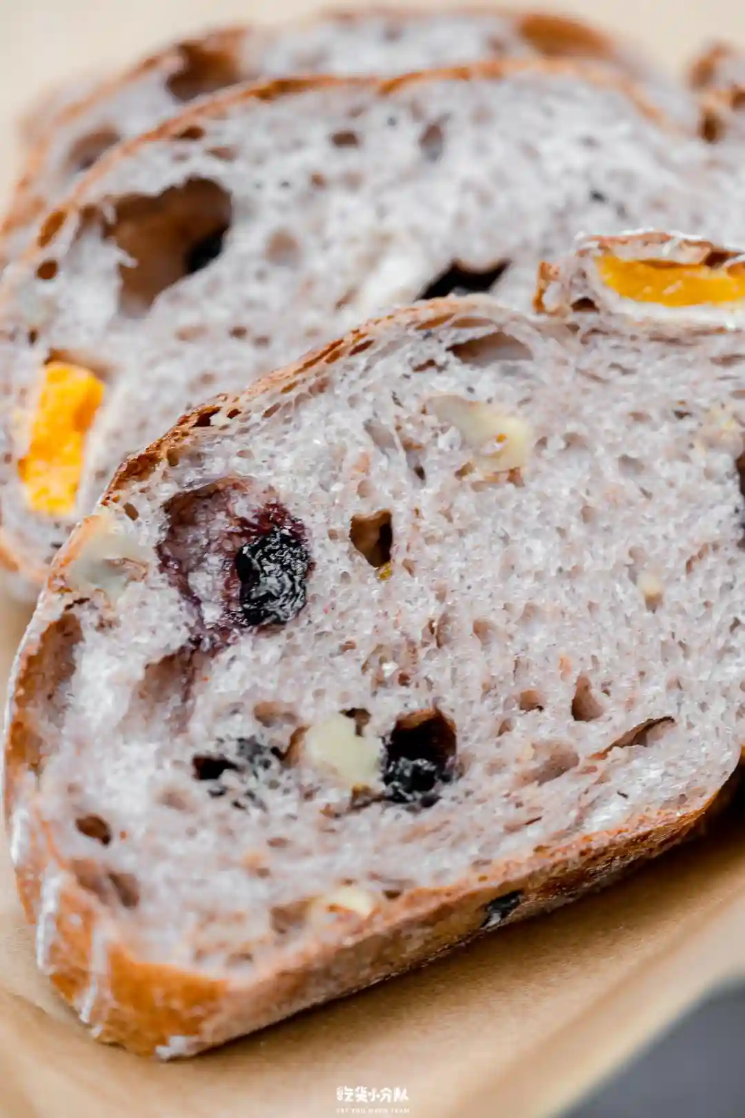 血麦蓝莓黄桃法包,采用法式T65面粉,加入富含高铁锌的血麦粉,融入黄桃干、蓝莓干、核桃果仁等多种果干。烘烤过程中,果干的清甜化入面包,果香与麦香交织交融,血麦独有的香甜,让口感更有层次。