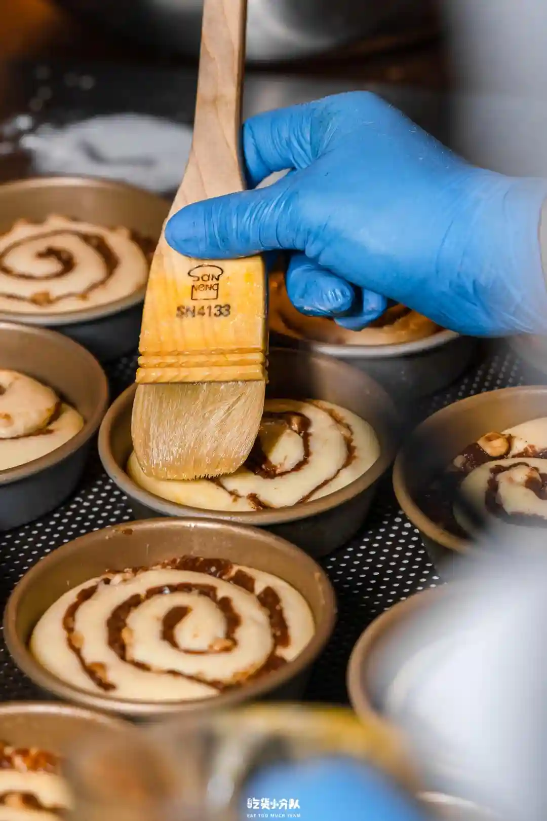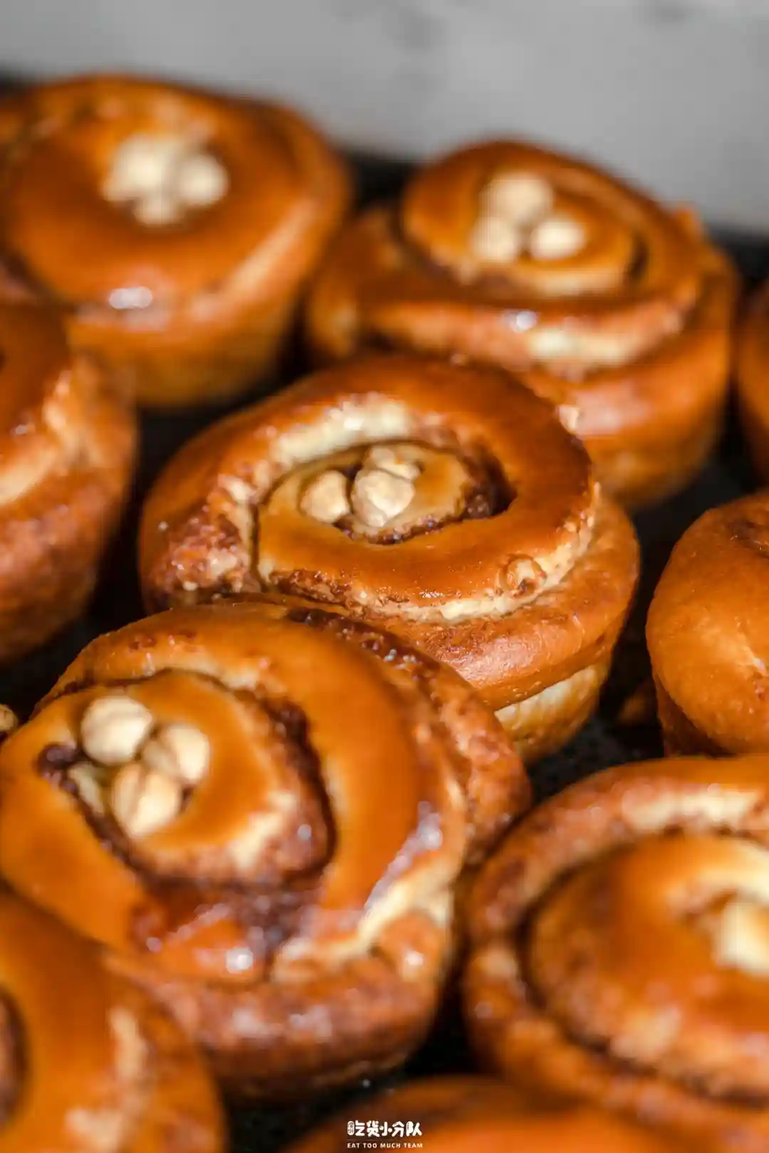 采用法国经典贵族布里欧面团,包裹着自制肉桂馅卷起,再搭配香脆榛子果仁烤制。赶上刚出炉的那一批肉桂卷,柔韧蓬松。一口咬下去,升级加量的肉桂馅,馥郁不甜腻。
