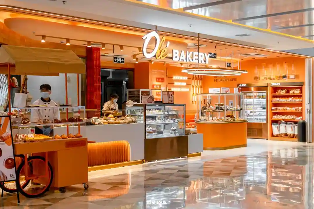OléBakery深圳第二家门店开进领展中心城,呈小麦色调的门店,精致的一方烘焙空间。半开放式烘焙工坊,购买面包的时候亦可欣赏烘焙师傅现场制作。即买即走,好面包即是日常。