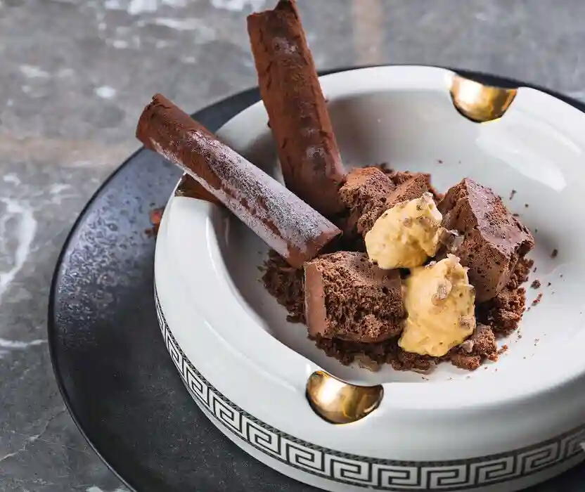 轻盈圭那亚黑巧,威士忌冰淇淋雪茄2支,烟熏海盐焦糖酱,榛子海绵蛋糕