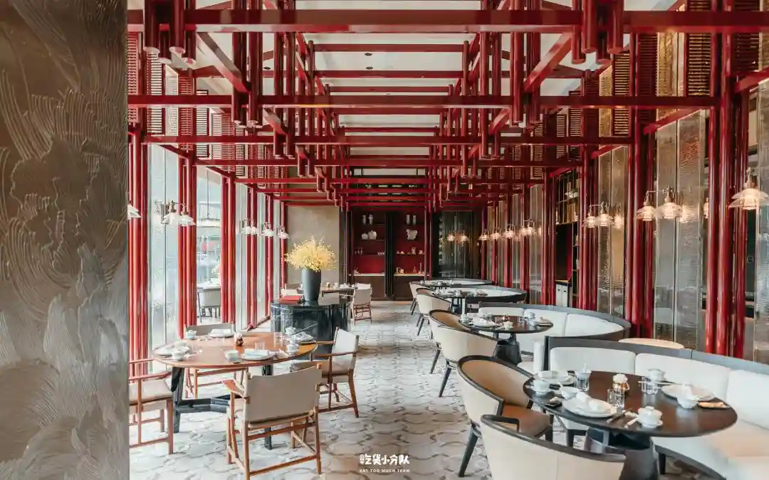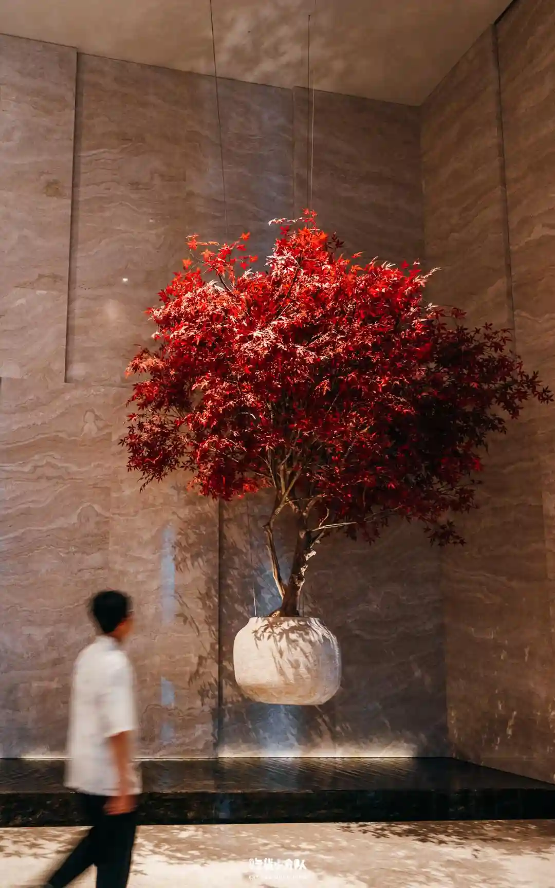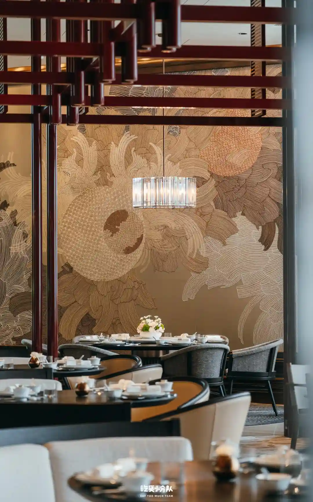 胤呈中餐厅,被一个水系花园环绕,室内设计由tofuinc负责操刀,以商贾的家宴为设计主题,选用了代表中国的符号之一“牡丹”元素,随处可见不同材质和形状的牡丹花,中国红的主基调尽显端庄大气。