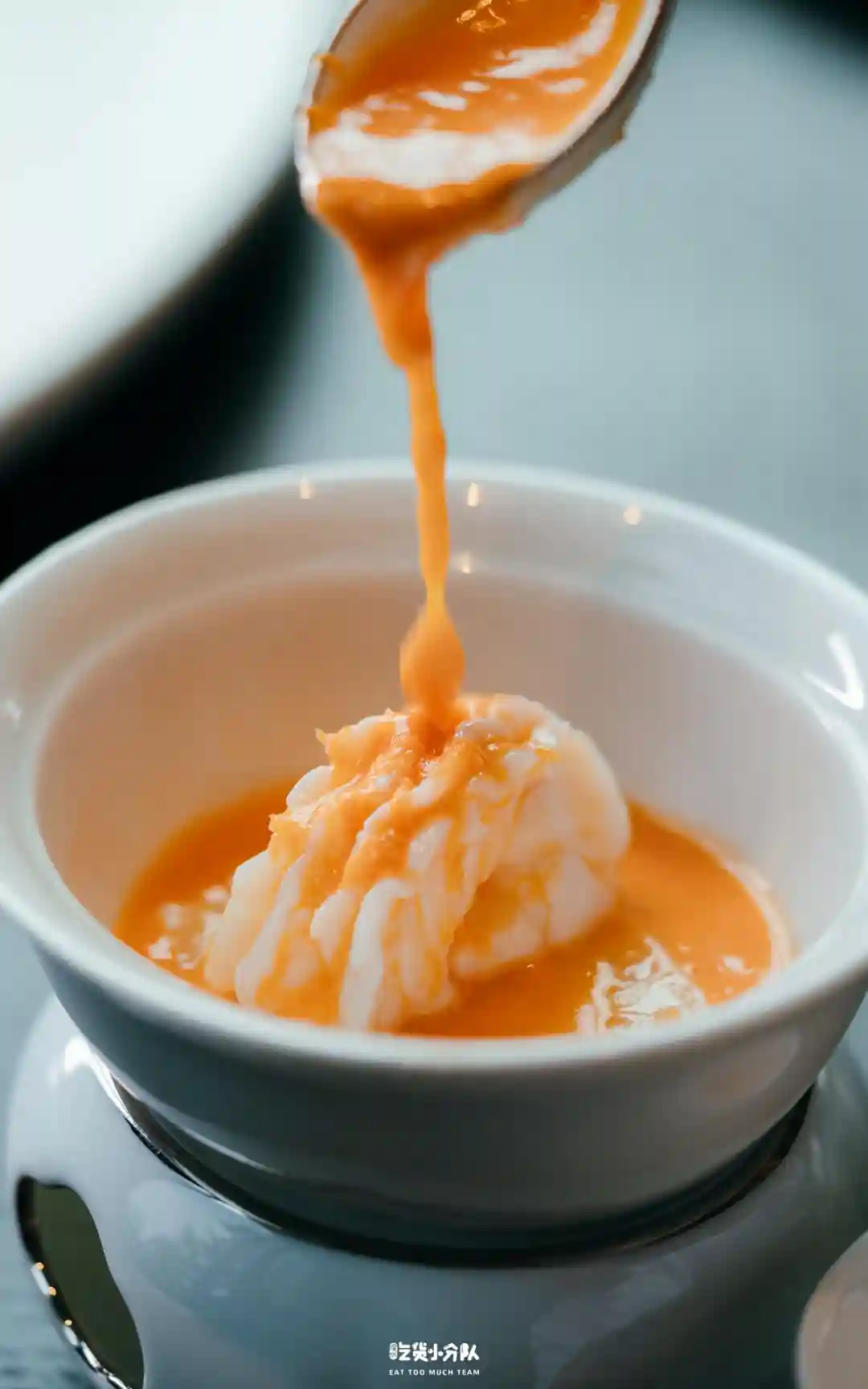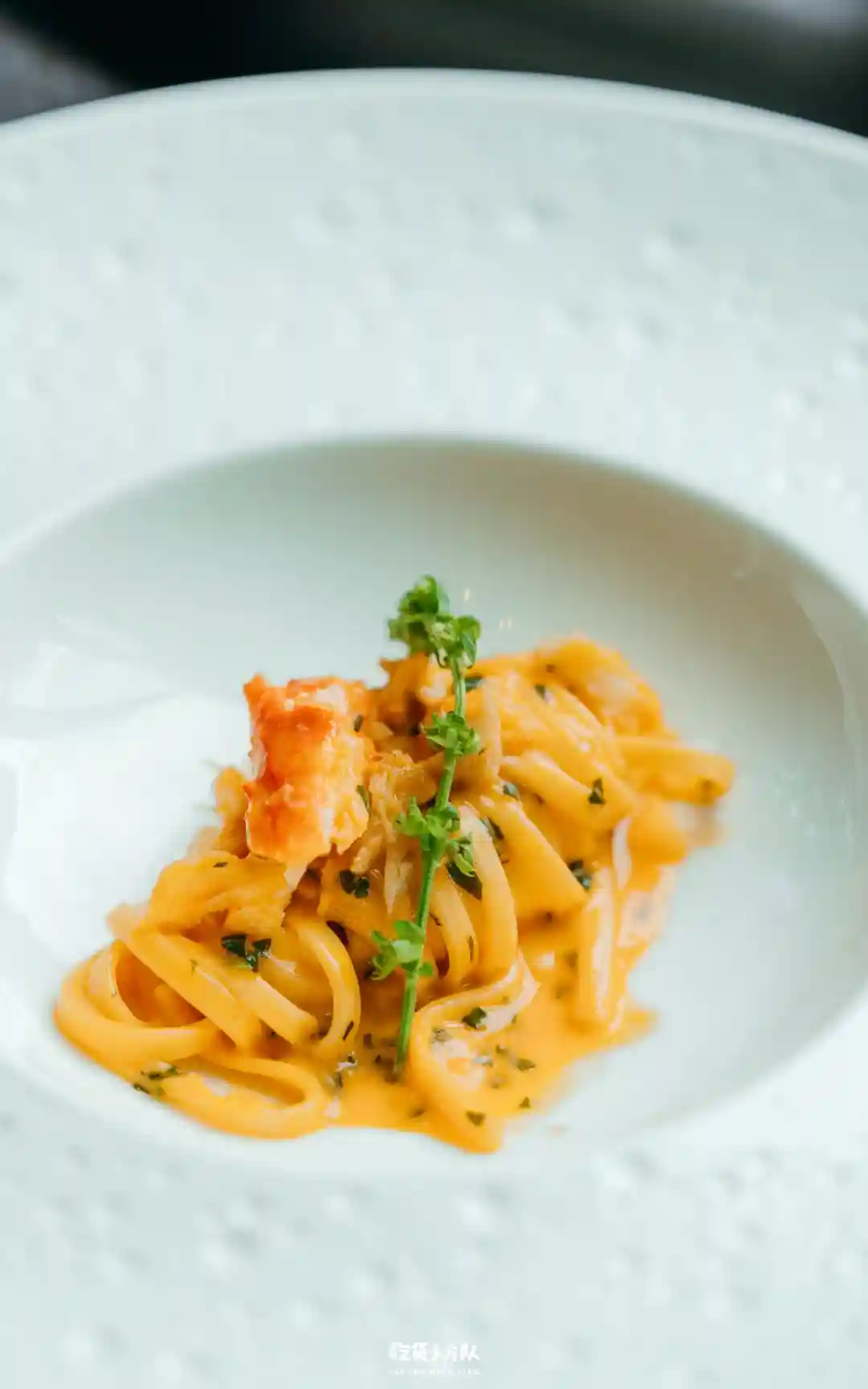 欧师傅新推出的菜品,采用堂灼形式,确保火候将酱汁和面条的配比控制到最好。现拆蟹肉佐以金不换及多种香料制成的酱汁,浓郁的花椒香气,吃起来非常开胃。