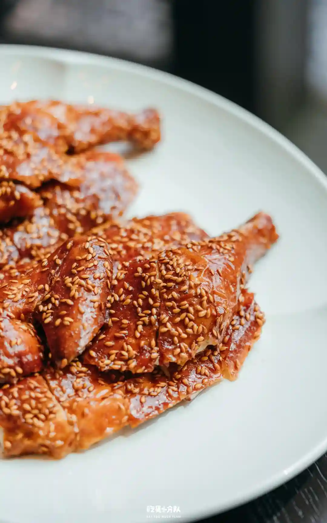 刚出炉的烧鸡还能闻到阵阵果木香和鸡皮表面的亚麻籽香,布满亚麻籽的鸡皮又香又脆,内里的鸡肉爽口嫩滑,汁水丰腴,配上酱汁吃,越嚼越香。