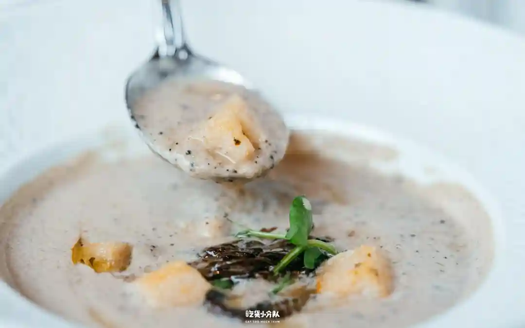 黑松露菌菇奶绒汤,丰富的菌菇熬煮成的菌菇绒汤,配上布里欧修面包粒,面包吸饱了浓郁的汤汁,非常入味,黑松露的香气馥郁,鲜咸可口。