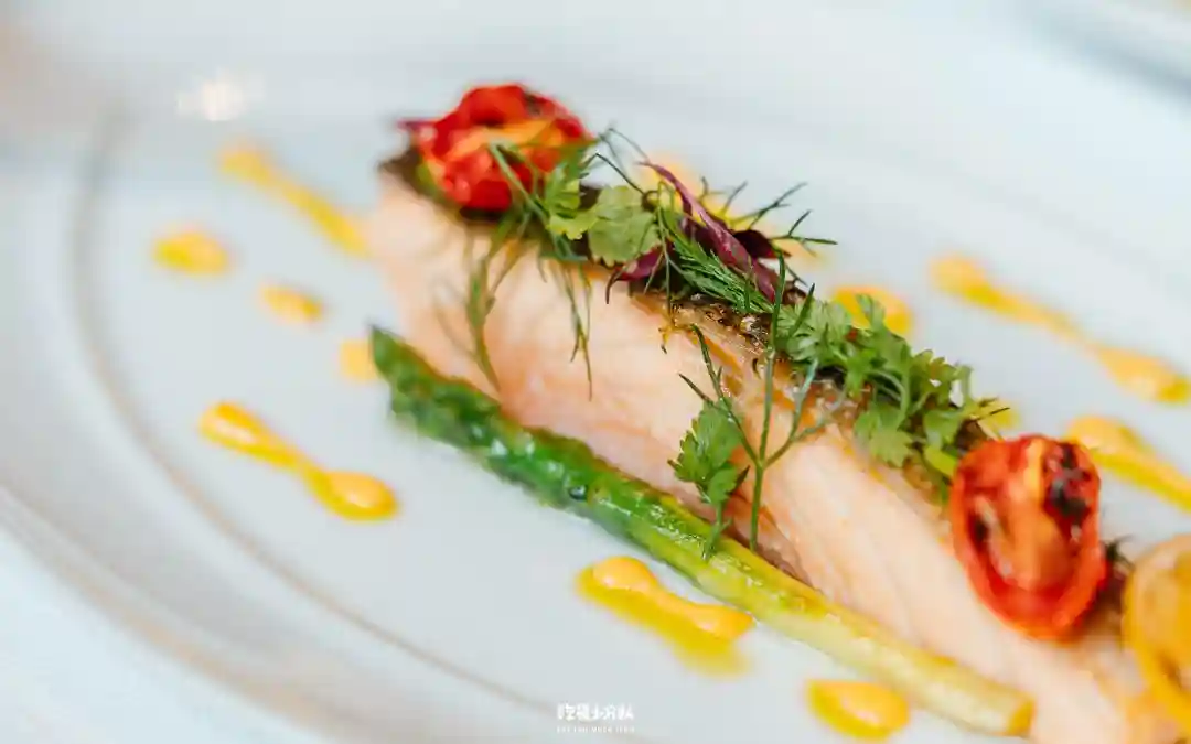 香煎橄榄油封挪威三文鱼,挪威三文鱼油封煎制熟度正合适,不柴不干,鱼肉细腻,佐以芦笋、芝麻菜、番茄、菠菜等配菜,色彩和口味都搭配得正好。