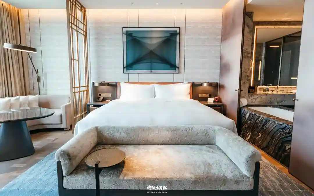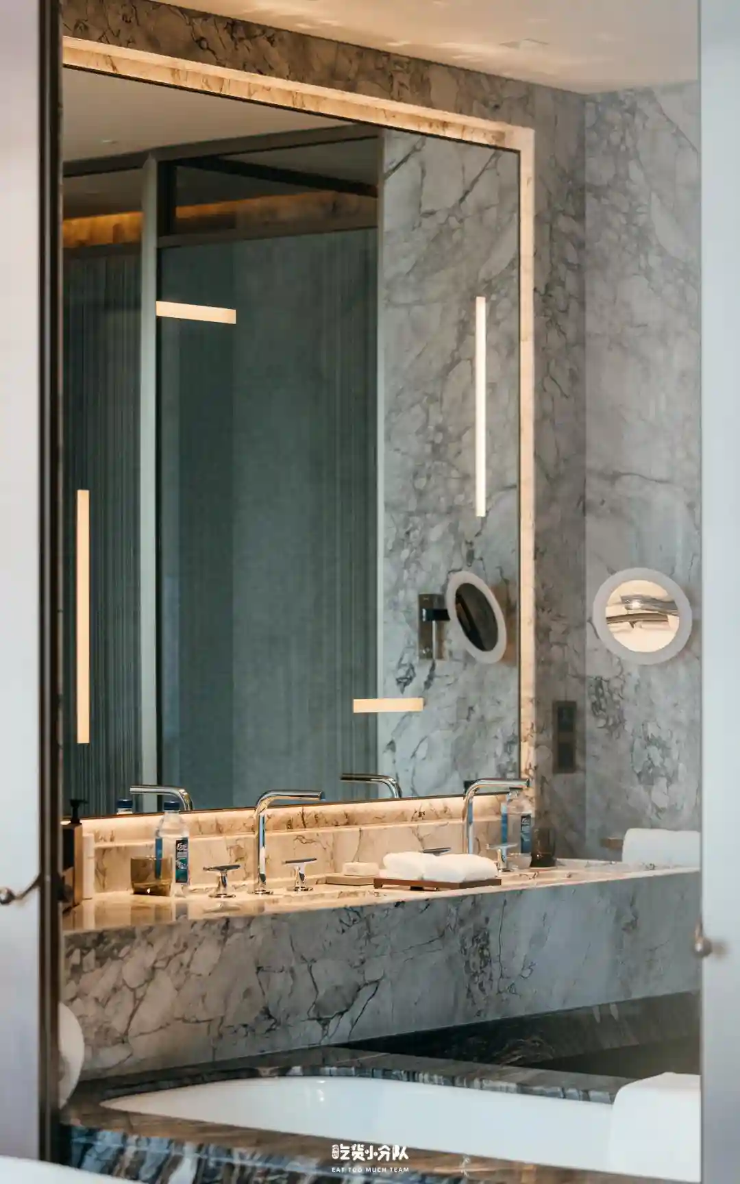 房间设计以新中式风格为主,屏风和柜子是Yabu的惯用手法,mini吧就隐藏在柜子里,首轮全免。入户出设置座椅,方便住客换鞋,非常贴心。卫浴空间简洁大气,配备全套BYREDO洗浴备品及DYSON吹风机,并配备卫洗丽洁具,细节满分。