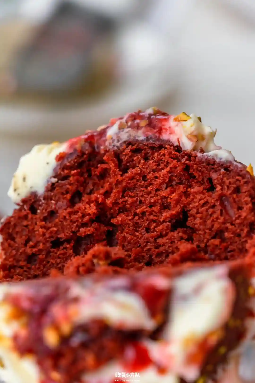 买这款杯子蛋糕的原因,同样是被试吃俘虏到(论试吃的重要性)。顶部是奶油干酪+开心果碎+蔓越莓树莓果酱,微微酸。蛋糕本身特别扎实,是湿润冰凉的口感。关键是跟很多商超里的蛋糕相比,真的不是很甜。
