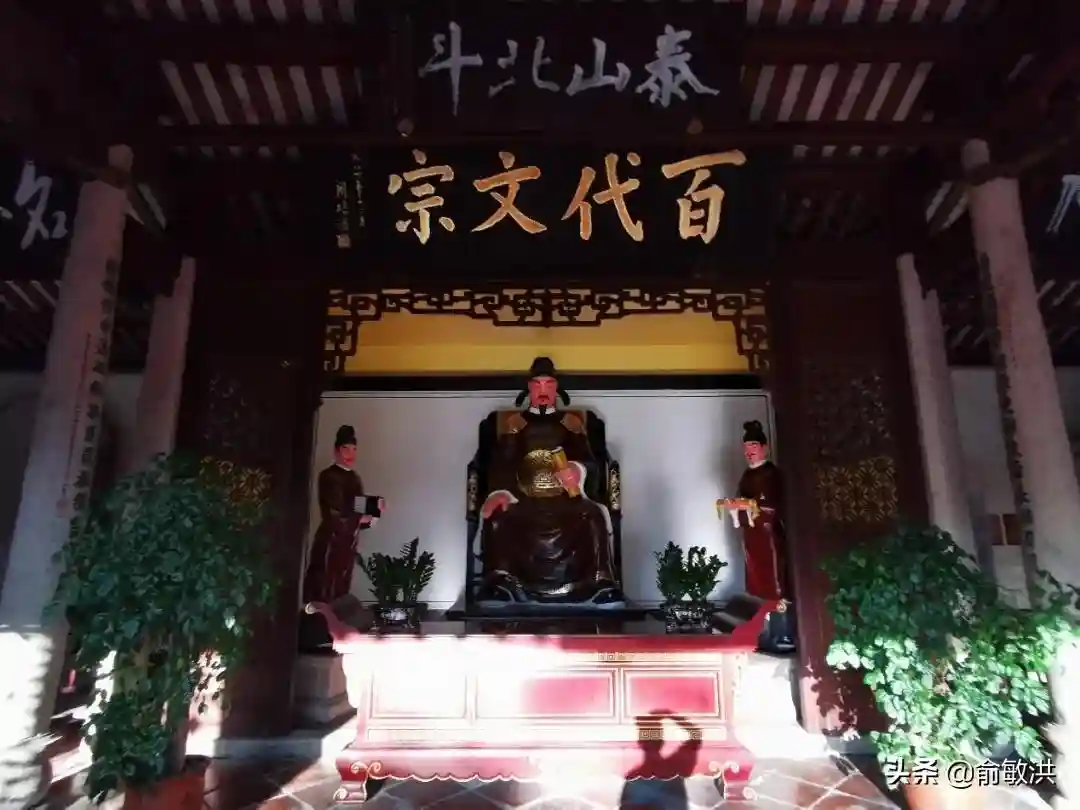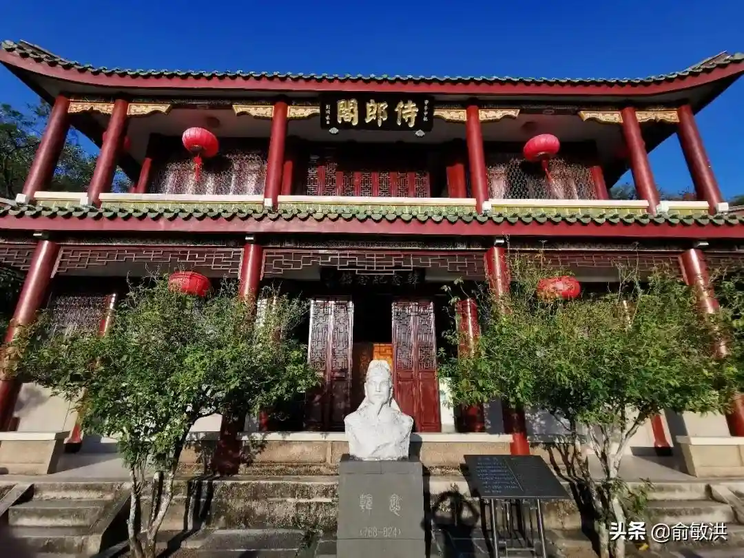 祠堂里面,正厅放着韩愈的塑像,显得有点胖,不像文人,更像官僚。我想象中,韩愈应该有一张忧国忧民的面孔才对。塑像上挂的匾额是泰山北斗、百代文宗等字样,墙壁四周是韩愈生平的介绍。从祠堂边上的台阶往上爬,就到了最上面的侍郎阁,也是纪念韩愈的,因为韩愈后来官至吏部侍郎。这是一个二层建筑,比下面的建筑要新很多,看上去是后来修建的,里面没有什么东西。下来的过程中,我寻找韩愈手植的橡树,但没有找到。不过我也不太相信橡树是韩愈手植的。韩愈那个时候,这里应该还是荒山。文人喜欢附会,估计这也是后世文人,为了故事的丰富性,附会出来的事情。