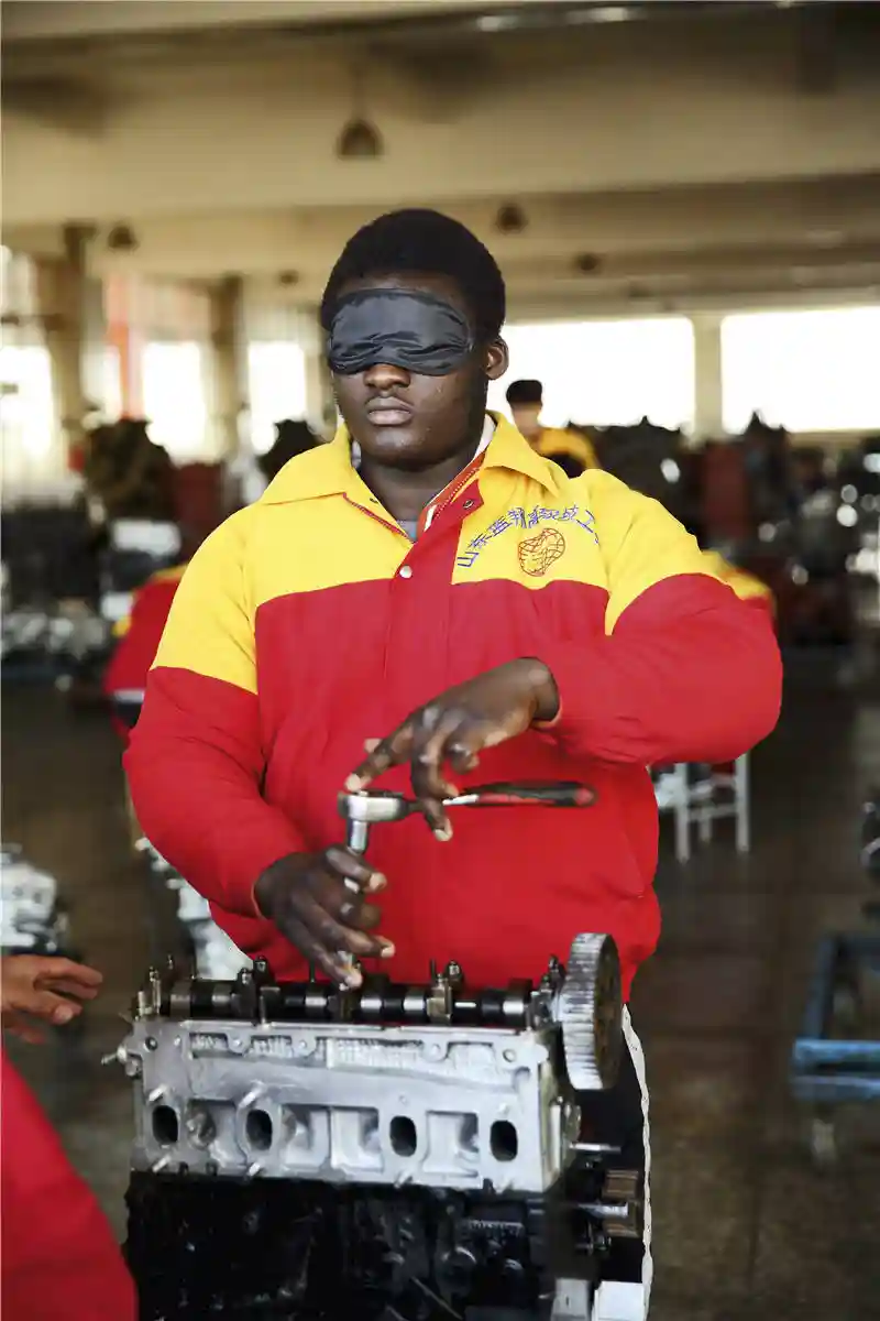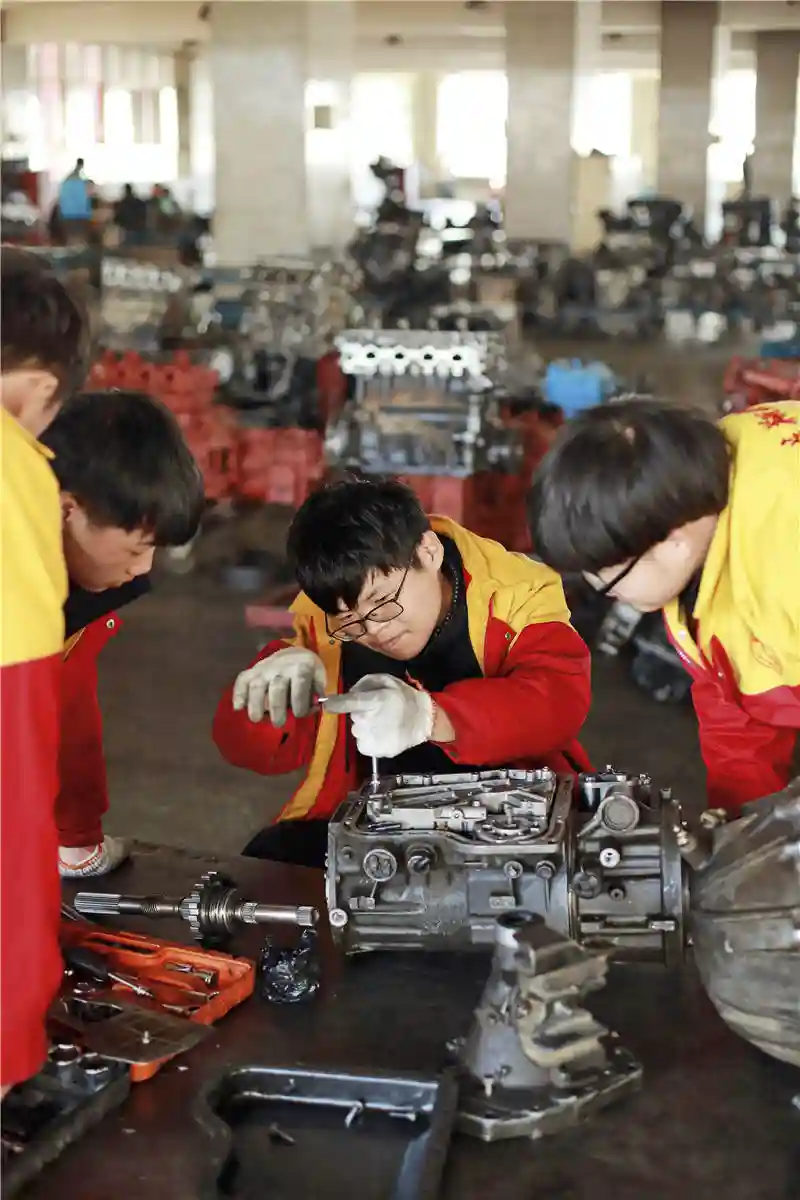 在汽修实训中心,学生正在动手拆卸汽车配件。“把工厂搬进学校”是蓝翔的教学特色之一