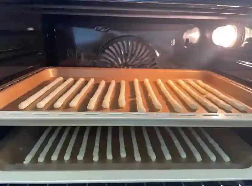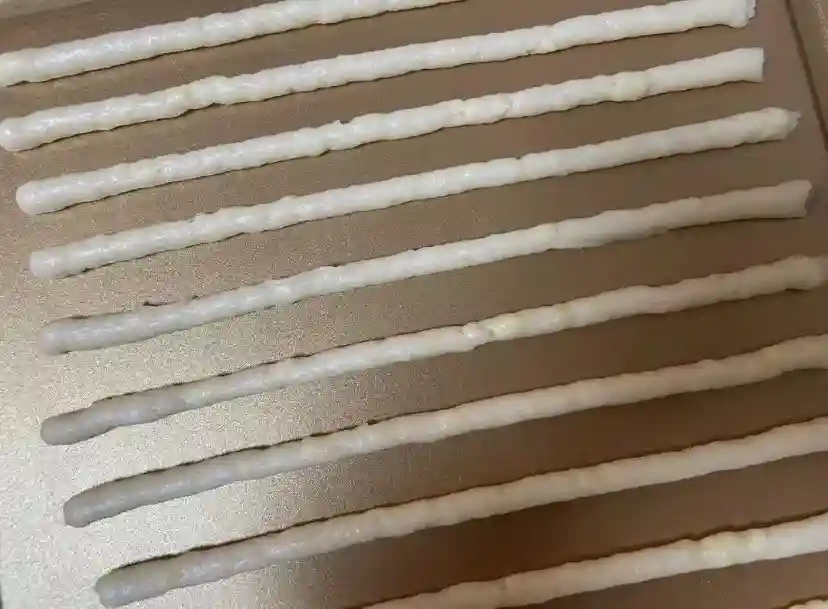 4、装进裱花袋,裱花袋顶端剪小口,均匀挤在烤盘上,粗细参考筷子