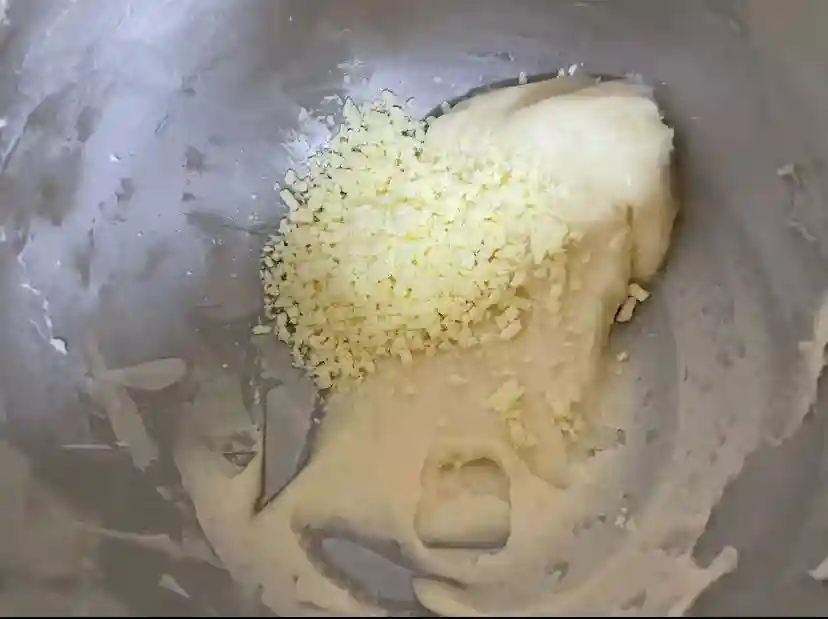 3、加入麻薯粉、细砂糖、盐、蛋液、芝士粉刮刀压拌均匀,再加入芝士碎混合均匀