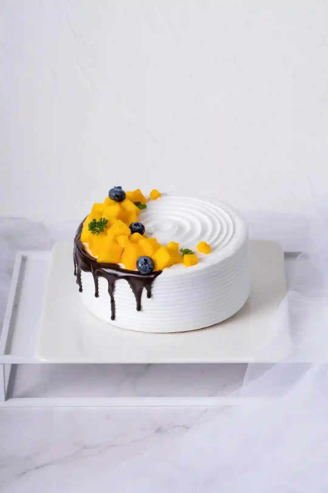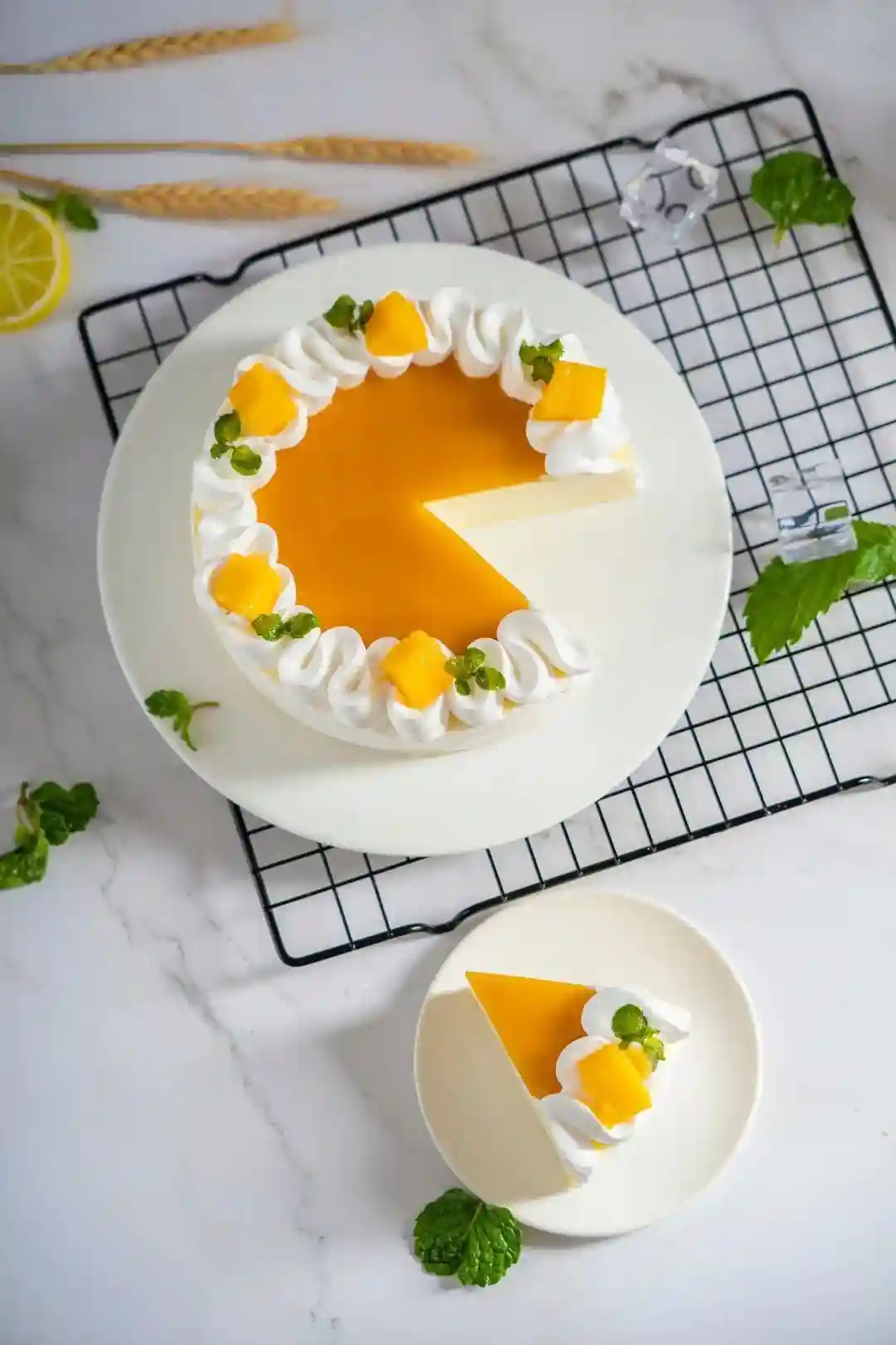 这款蛋糕整体是白色和橙色的搭配,橙色是个很具有青春活力感的颜色,本身就是让人一见就喜欢的颜色,加点绿色的薄荷叶就更加小清新啦!