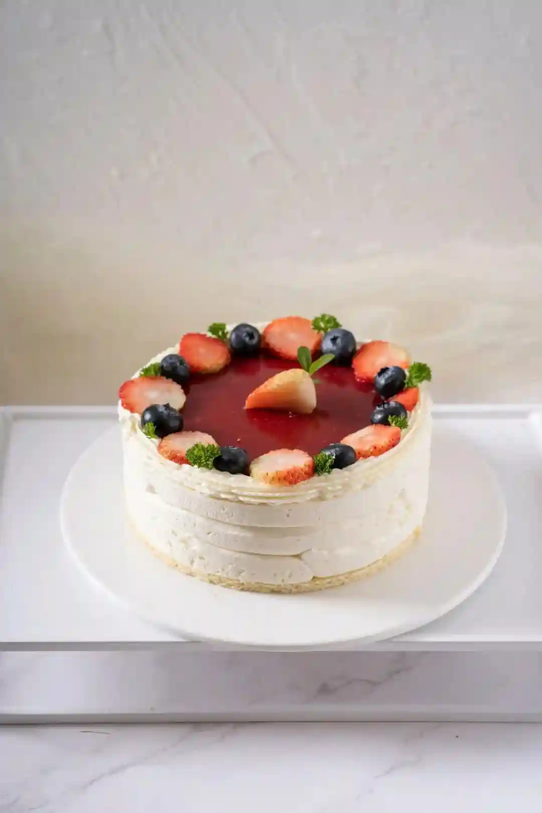 红色一直被大家认为是暖色调,可是这款蛋糕却还是很符合小清新的风格!因为红色只用作蛋糕上层的装饰,整个蛋糕没有过多的装饰。