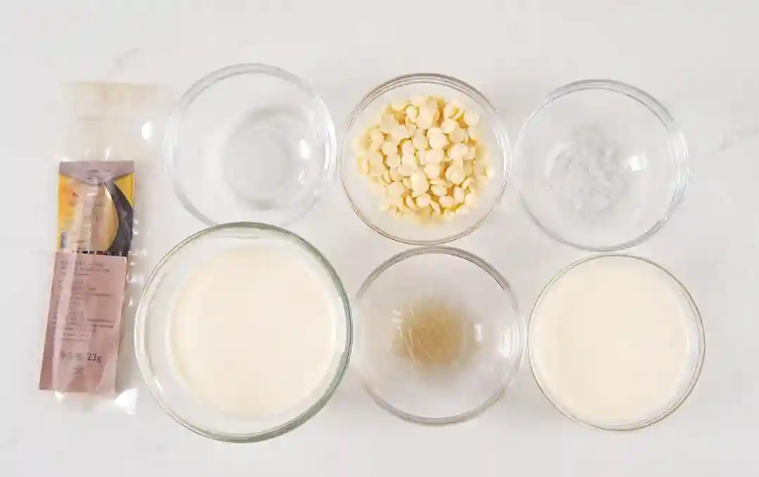 1、淡奶油A、海盐和香草籽混合搅拌加热煮沸离火,冲入到白巧克力中,加入泡好的吉利丁片后用均质机均质打匀。