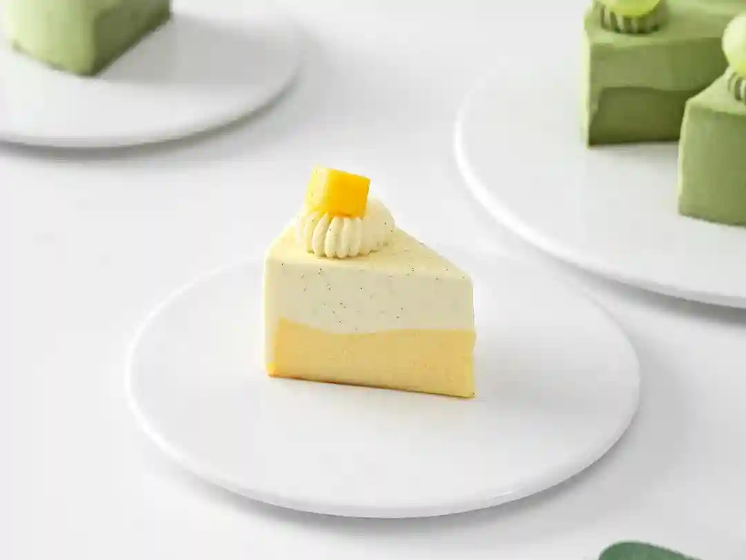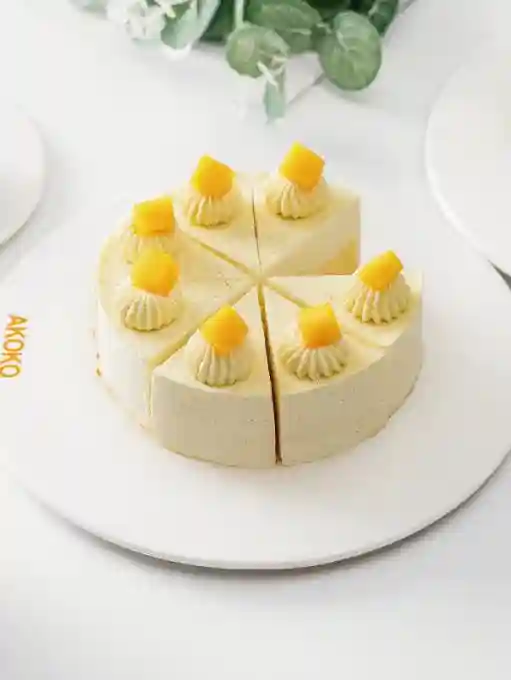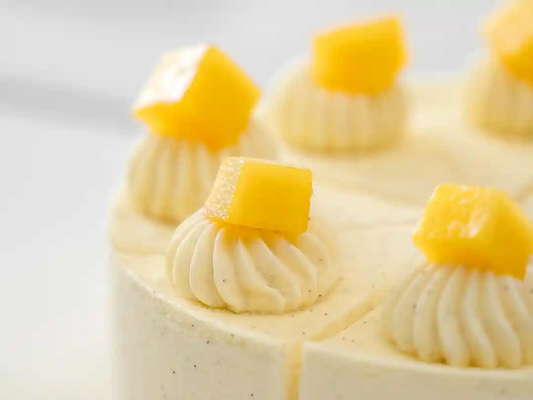 3、室温解冻1小时左右,将蛋糕进行切件操作,表面裱挤上打发的香草奶油,装饰上新鲜切块芒果。