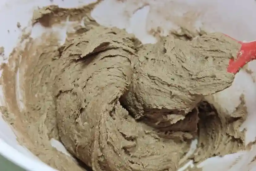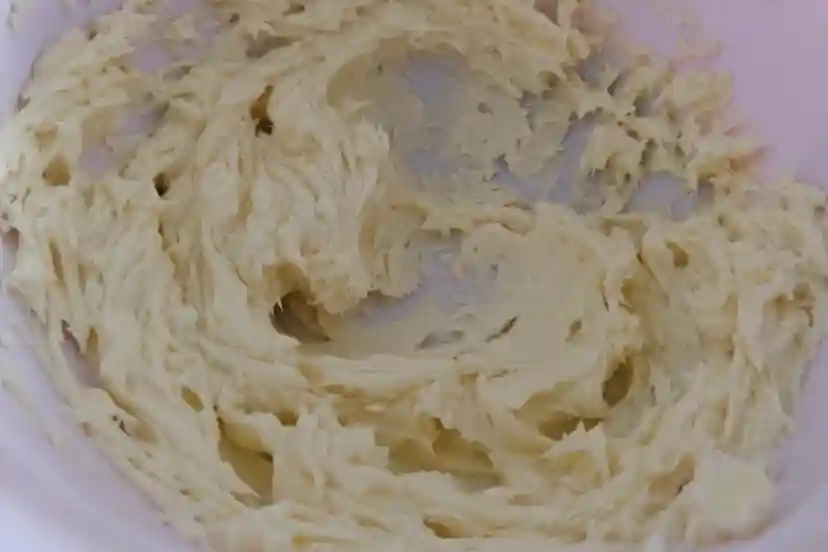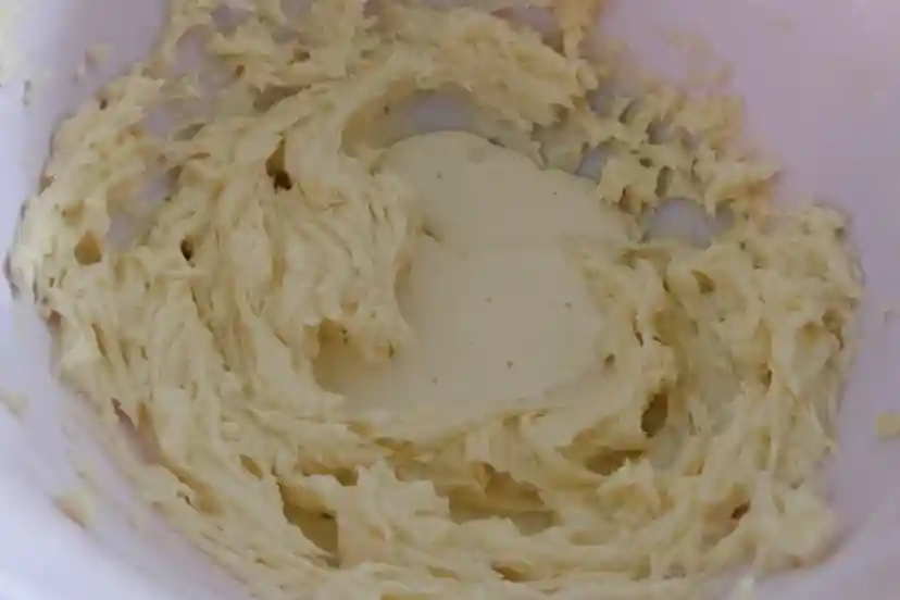 8、把粉类混合过筛到打发好黄油里面,用刮刀压拌均匀无干粉,面糊细腻光滑的样子。