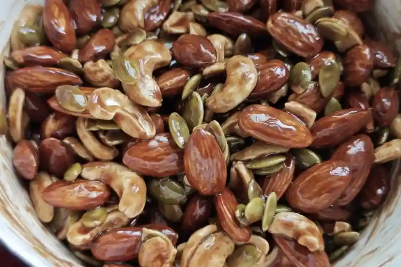 3、趁热放入事先准备好的坚果搅拌均匀备用。
