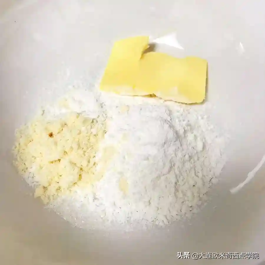 1、先准备奶酥粒的材料,黄油室温软化加砂糖、低粉、杏仁粉。