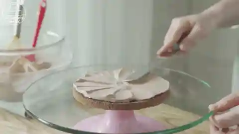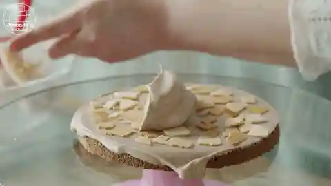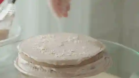 12/接着放入第二片蛋糕胚,抹一层奶油,放上坚果碎或脆片,抹上奶油后盖上第三片蛋糕,接着重复刚才的动作,直至4片全部抹完。