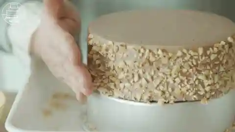 14/取剩余的脆皮和榛子仁,黏在蛋糕周围,放入冰箱冷藏30分钟以上定型。