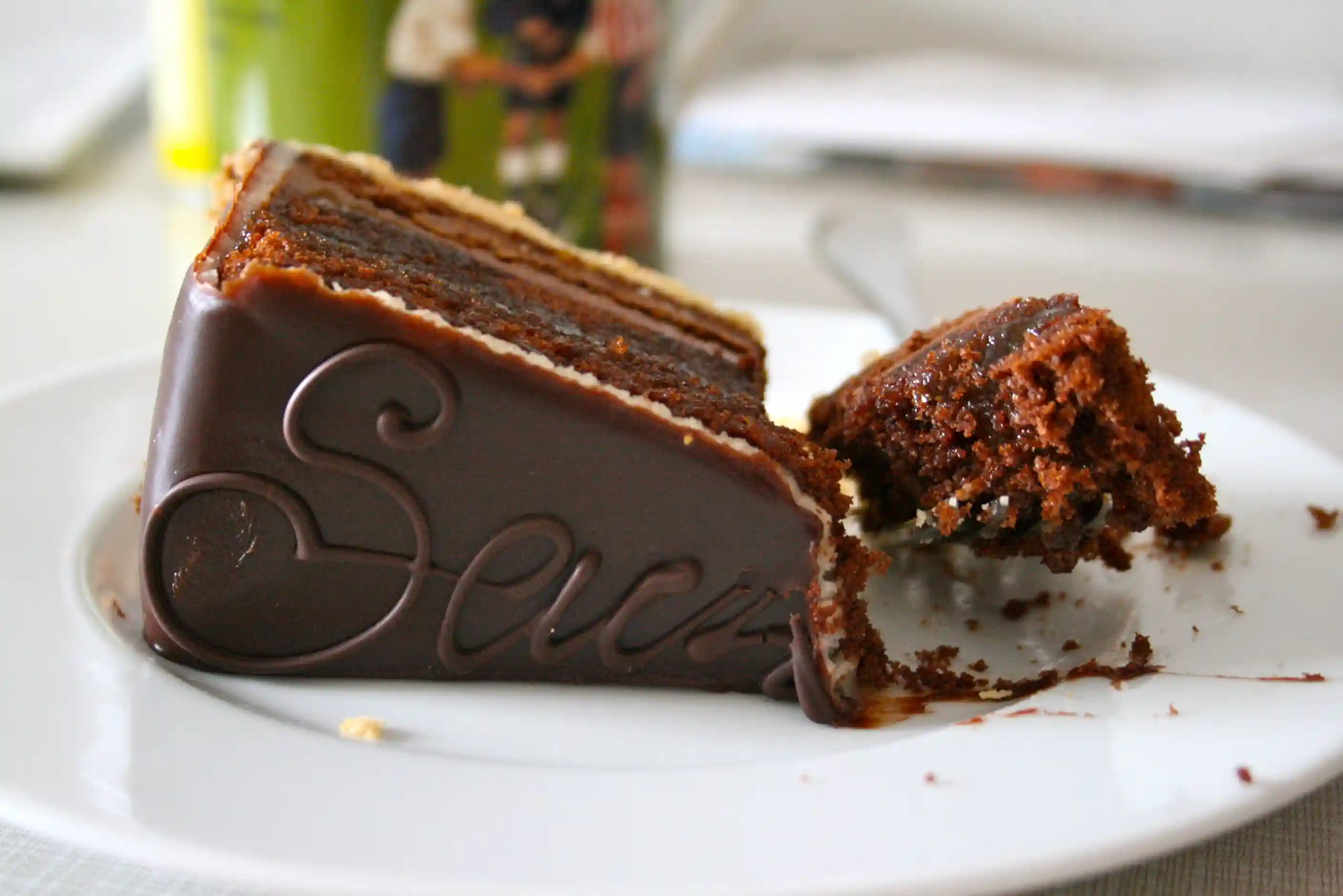 奥地利的传统面包店都会有这道甜点,它是奥地利的国宝级甜点,由两层甜巧克力和杏子酱做成,上面还撒有巧克力片。