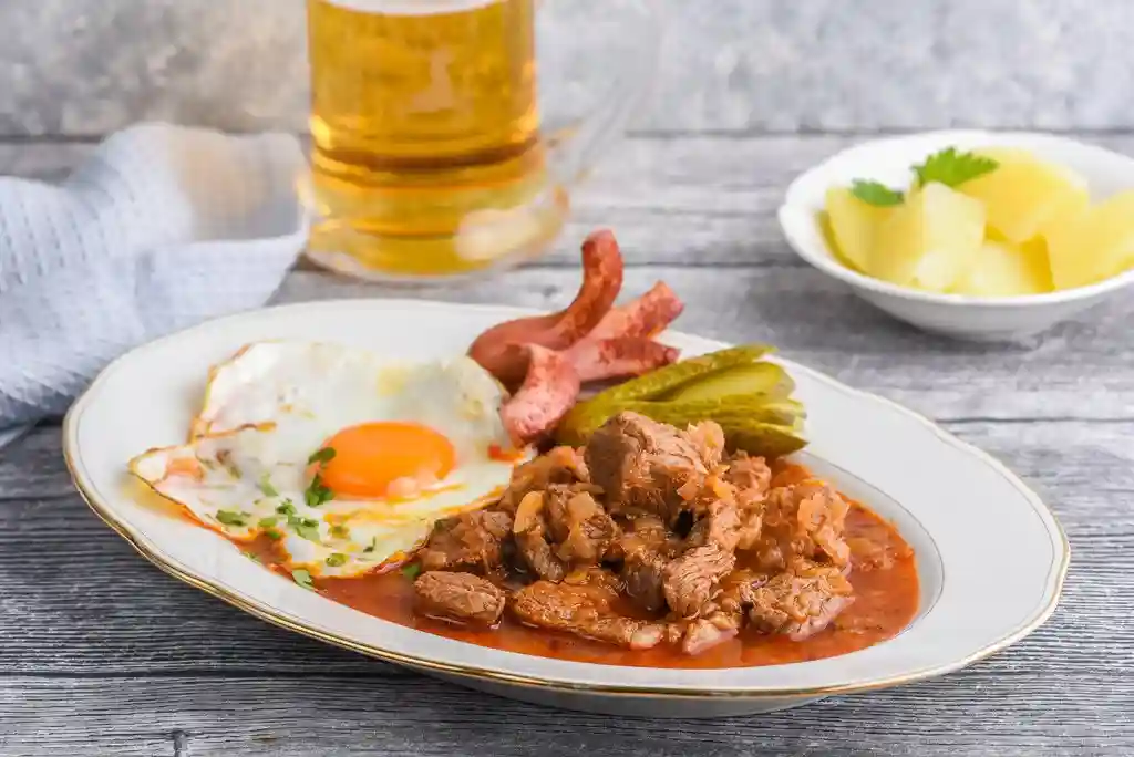 马夫烩牛肉通常搭配维亚纳香肠、腌小黄瓜、面包饺、单面煎蛋等。同时,这道菜还可以用来解救。