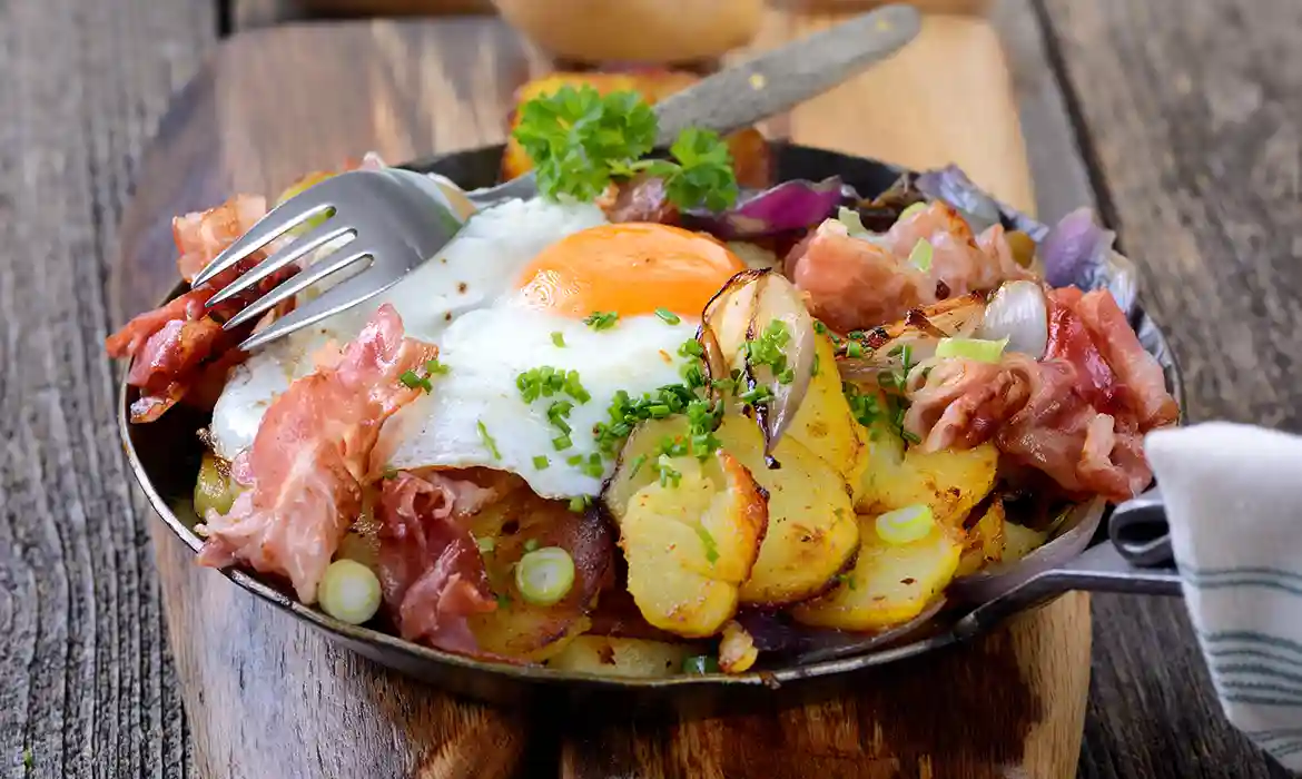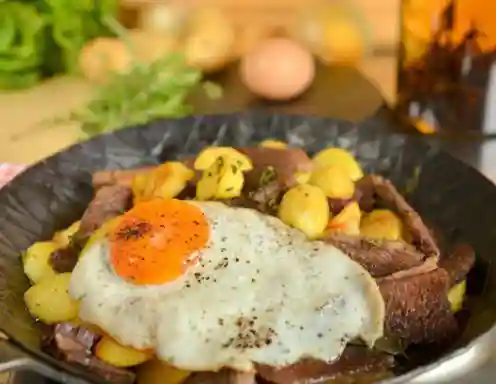 它是由土豆、切碎的牛肉或猪肉加上大量的黄油和洋葱而成,通常上面还会放一个煎蛋。