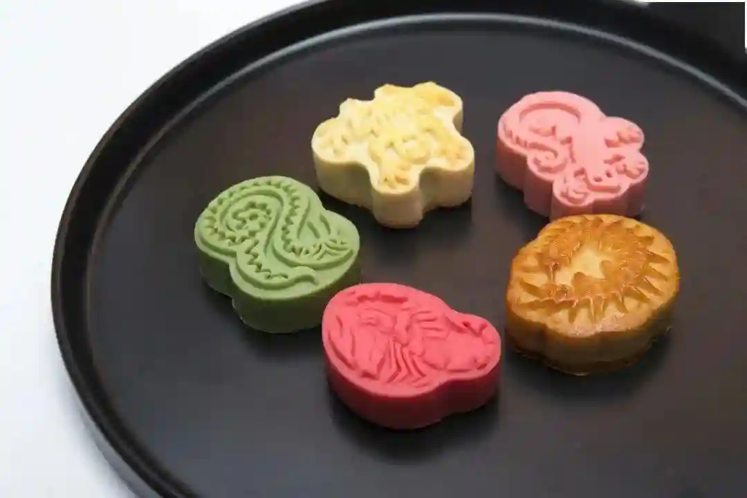 年节时才有成套月饼,五个月饼为一套,最上边是个桃,桃上面写有福字,下面是个没有装馅的盖子,下边月饼一个比一个大。