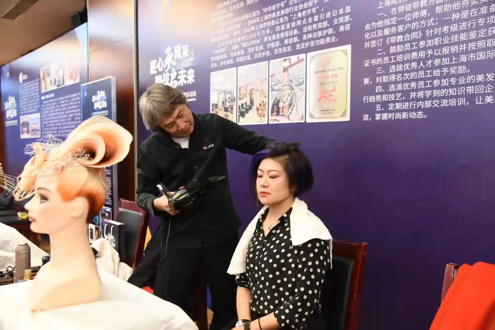 在另一个展区,上海南京美发公司高级技师龚建林正在为一位女士做着花式盘头。现场展示了从1930年至2010年的男女士流行发型演变,体现了年代更迭里,海派技能的发展和审美观的改变。从事美发行业39年的龚建林带教过徒弟,多名徒弟多次获得上海美发美容大赛总冠军。