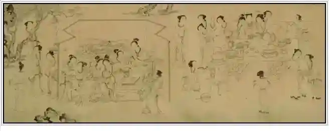 此卷用白描法写出七夕夜间庭院中妇女们燃烛斋供的情景。南朝梁宗懔《荆楚岁时记》载:“七夕,妇人结彩缕穿七孔针,陈瓜果子庭中以乞巧。有喜网于瓜上,则以为得。”图中贵夕3成群,或立或坐,或相互交谈,或成群结队,或轻盈漫步,或仰穿针线,动态多姿。众侍女忙于上灯、烧水、。执壶、捧盘、抬桌。画卷结尾到向天斋供为止,类似连环画,反映了七夕乞巧的风俗情景及过程。庭院内以翠竹、假山、松、梧等为布景。七夕聚会,沉浸在秋凉夜静的气氛中。妇女发丝,着墨细匀,衣褶线条流畅,饰纹刻画细致,佩环飘动,得“吴带当风”之姿。在此选其中两个场景。