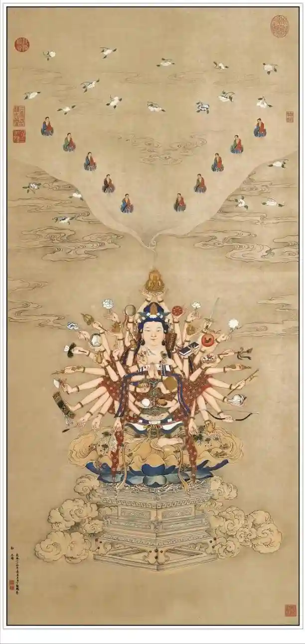 此藏品为清代丁观鹏所绘的宝相观音图。图绘千手宝相观音一尊,各手分别持小斧、莲花、宝剑、弓箭等各种法宝;头上祥云朵朵飘荡,云中托出小佛十尊,花朵飞扬。观音面容和手臂作多层烘托,有较强的立体质感。说明作者在继承传统技法的同时,也吸收了西洋画的明暗、透视等特点,形成了自己的风格。