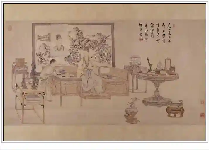 从形式看《弘历鉴古图》借鉴了《宋人人物图》构图风格,基本坐姿和手部姿态与《宋人人物图》雷同,书房中家具摆放格局也没有过多变化,只是书房家具整体呈现出皇家繁复华贵的风格。诚然,画作更深层次地在刻画乾隆的思想和内心活动,以及展示乾隆精于鉴藏,并且在诗律、书法等方面同样有着骄人的一面。此幅画作在中国画散点透视的基础上,借鉴西洋透视和设色技法。画面以线描淡彩渲染为主,用色淡然、素雅,低调而不张扬,更显中国文人雅士含蓄内敛、脱俗的风范和所追求的意境。