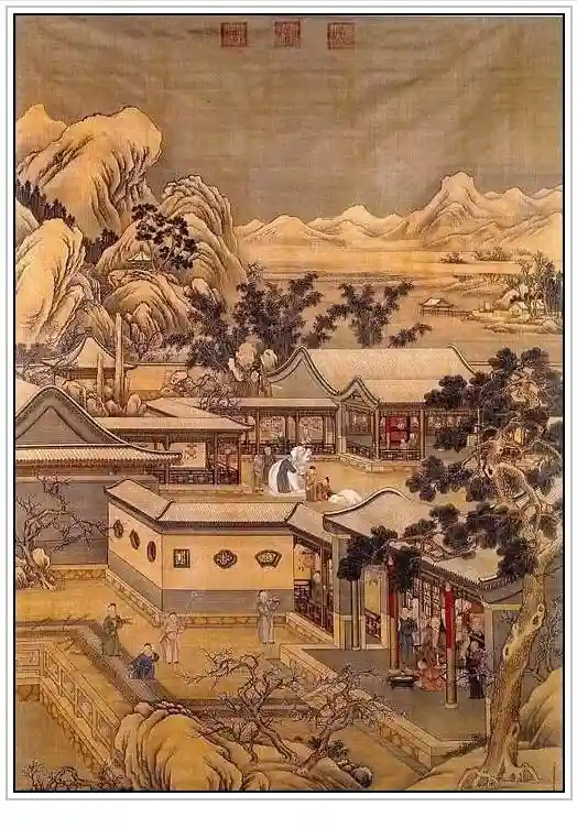 戏台商铺,骡马车旅,喧嚣吆喝之声似在耳畔;屋宇鳞次栉比,人物衣着鲜亮,一派富庶景象。近景的描绘,尽展画家的高深造诣。其飞檐画栋、横廊阶梯,以及一切陈设,无不逼真肖似。一静一动,趣味横生。