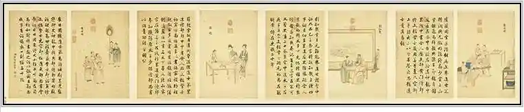 此册右幅描绘唐中宗与修文馆大学士,君臣吟诗撰文的盛会或成名事迹,左幅为庄有恭书写学士名号及历任官衔。全册共二十四开。