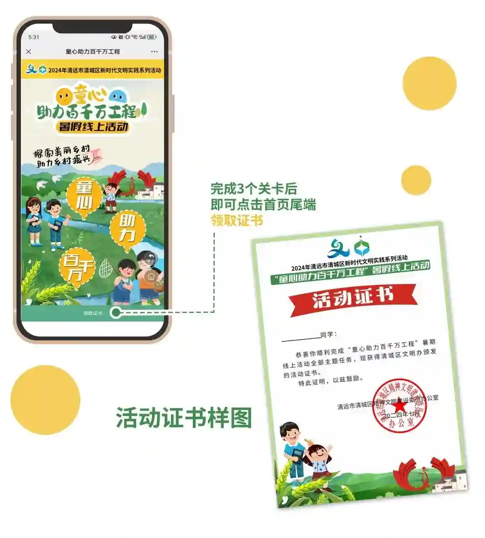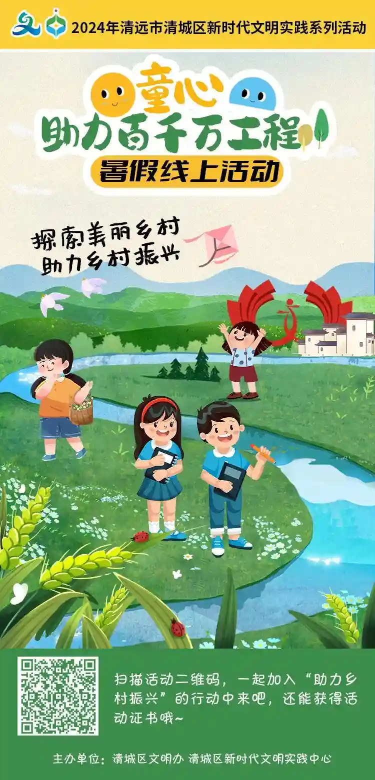 为充分发挥清城少年儿童积极投身“百千万工程”的热情,清城区新时代文明实践中心即将开展“童心助力百千万工程”暑期线上活动。