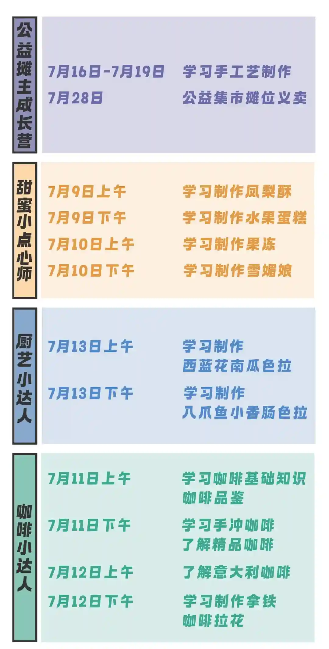 体验内容:学员通过4天摊主技能学习期学习🎨手工艺制作、💡销售技能、👫服务技能等,并在公益集市上成为我们的公益小摊主,让学员开创自己的“地摊经济”梦想。