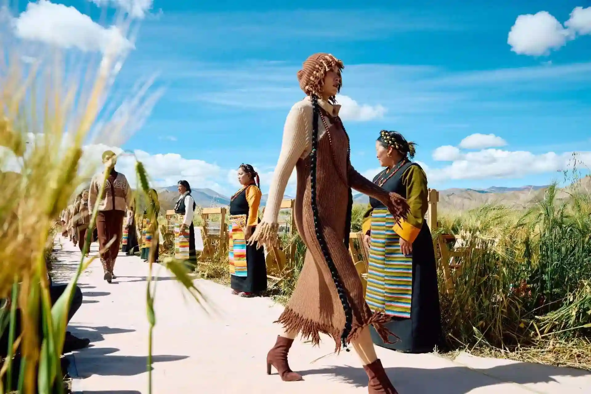 通过一系列宣发,沙涓也为氆氇产品拓展了销路,在郭秀玲心里,正在酝酿着一个“Sandriver沙涓氆氇复兴十年计划”。2023年9月,在上海援藏干部、当地市县的协同支持下,沙涓在海拔4800米的乃钦康桑雪山下举办了“雪域·回响”传统氆氇服饰工艺时尚秀,随后在上海、北京等地举办了21场氆氇秀,吸足眼球。2024年9月,沙涓在江孜县班觉伦布古村落再度举办西藏氆氇系列发布秀,这次的主题是“雪域·交响”,古老藏寨与青稞大地相互映衬,30位西藏氆氇手工匠“阿佳”在现场展示梳毛捻线的繁复氆氇工艺,纺织机经纬碰撞之声与艺术家钢琴独奏构成宏伟的羊绒氆氇协奏曲。