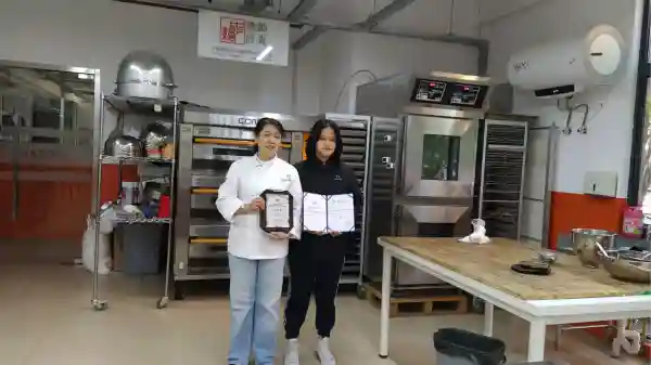 图说:王逸(右)前不久在全国焙烤职业技能竞赛上海赛区的比赛中获得银奖。