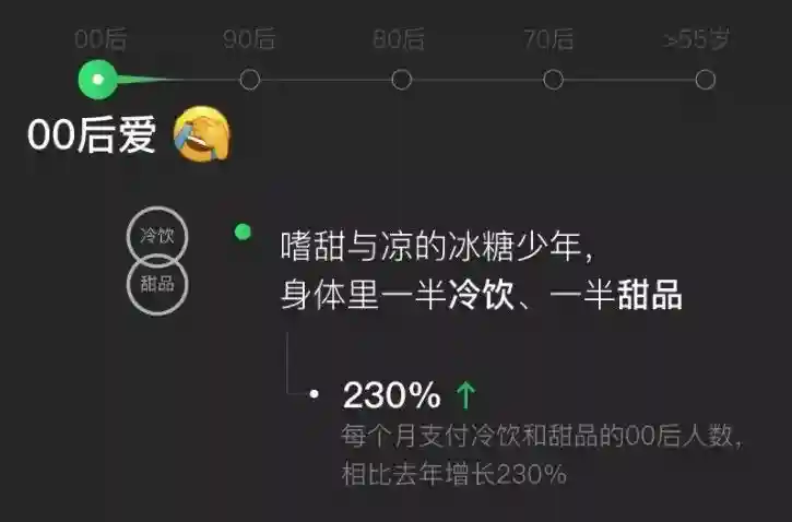 其中,90后00后的年龄段,尤其偏好甜品。微信年度数据显示,每个月支付甜品的00后人数,相比往年增长了230%。