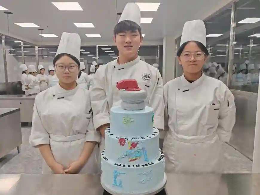 学生们以小组形式合作,共同设计创作多层蛋糕。他们积极讨论,围绕亚冬会主题展开创意构思,有的负责设计蛋糕整体造型,有的专注于色彩搭配,还有的精心雕琢每一层的裱花图案。在制作过程中,小组成员分工明确,齐心协力。从底层蛋糕的抹面,到中层的装饰以及顶层的主题呈现,大家相互协作,共同攻克一个个难题。