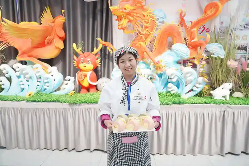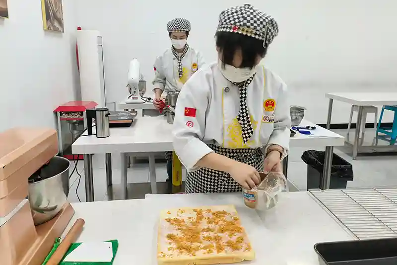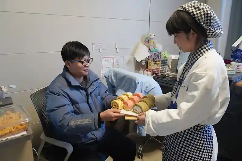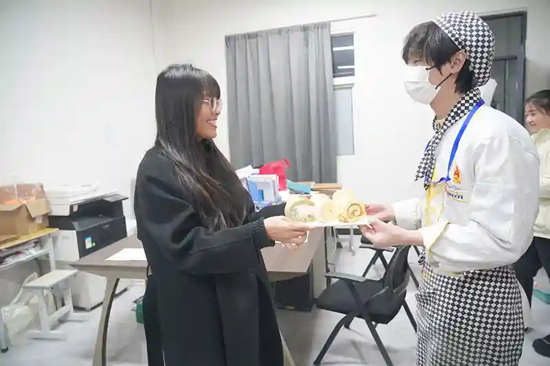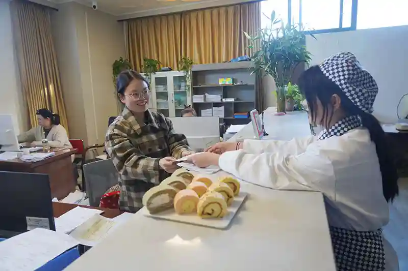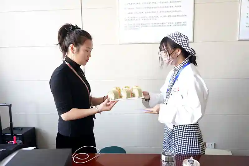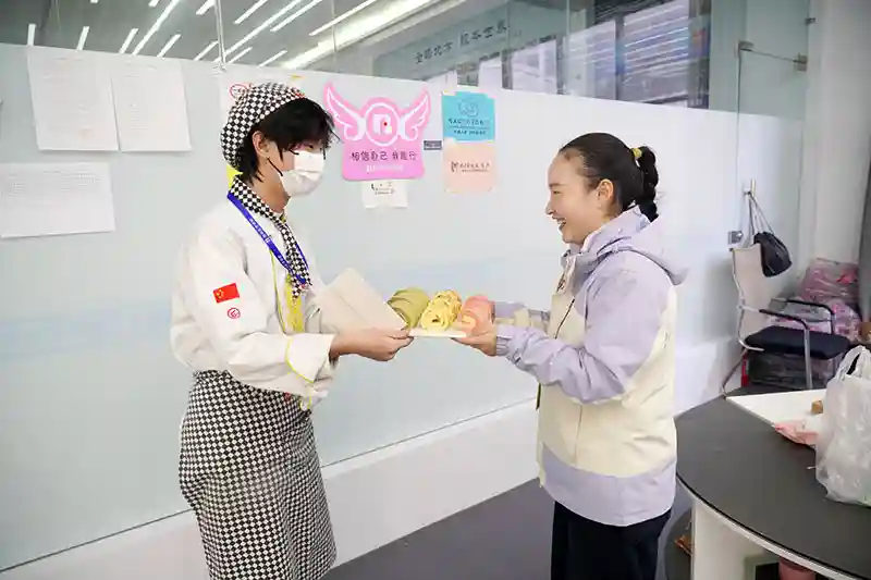 西点专业的教室里弥漫着甜蜜的气息,学生们忙碌而专注地制作着蛋糕卷。从精心挑选原材料,到准确地调配比例,再到细腻的烘焙过程,每一个环节都倾注了学生们对老师的感恩之心。大理石蛋糕卷的纹理如艺术画作般精美,抹茶蜜豆蛋糕卷散发着清新的茶香与甜蜜的红豆味,香葱肉松卷则融合了咸香与松软的口感。