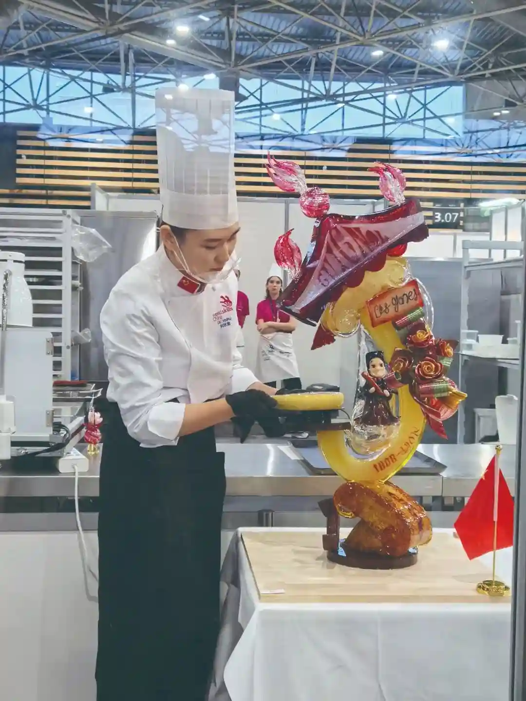 其实,糖艺作品的制作难度非常大,成品热胀冷缩易碎,遇高温易融化,并且考验创作者的想象力和创新力。刚开始学习拉糖工艺时,拉扯高温糖块烫出的一个个水泡、大型作品拼装时突然倾倒侧翻、高强度训练引发的肩周炎疼痛等,这些对刘欣茹都是家常便饭。低头案台、抬头墙,枯燥与疲累你来我往,日复一日,她如此过了四年。但也正是这四年,为她打下了坚实的糖艺根基。