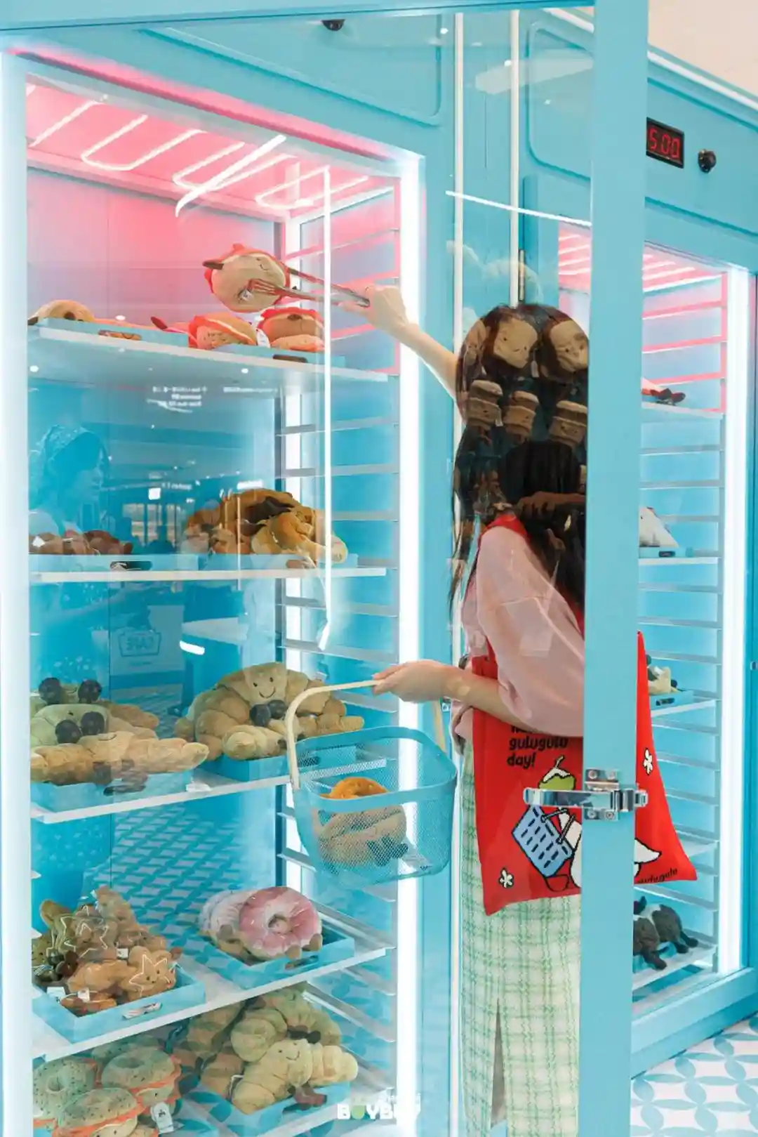 第一个空间打造了一家JELLYCAT面包房,货架上摆满了各种热门款烘焙小玩偶:羊角包、热狗、吐司、咖啡、蛋糕卷……可爱又柔软,令人爱不释手眼花缭乱。