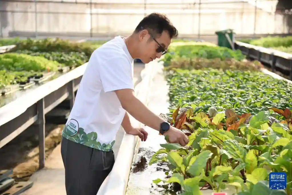 澳门青年孙振鸿在位于广东珠海的农场内查看蔬菜长势(2024年11月28日摄)。新华社记者洪泽华摄